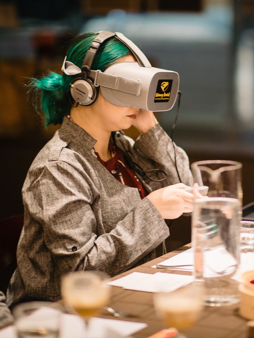 JD: VR has made my work more impactful because it can take our guests to a place where they can be alone to think and listen, even in the midst of a crowded dinner table. Ever since I started hosting my own pop-ups, my focus has always been about using food and drink to better engage people in a deeper, more profound way. At a communal dinner, it’s hard to balance extroverts and introverts at the table. The introverts tend to lose steam and then the extroverts dominate the entire conversation for the rest of the night.