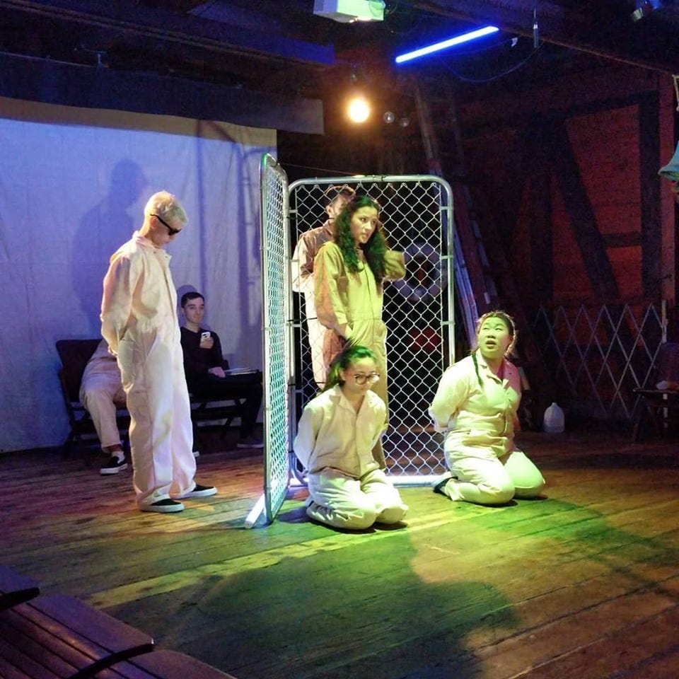 The performance being with a warm-up exercise to create a safe and collaborative space. As an audience, we work together to create an environmental soundtrack through making noises. It’s very well executed but the need for an audience-created soundscape never appears again in the two-hour long performance. We are also warned multiple times during the beginning that there will be an evacuation scene in the piece, but that we should not be alarmed when this occurs. However, this scene ends up taking place within the first ten minutes of the show; it consists of flashing lights, a blaring alarm, and the actors moving benches from the front of the space into the sides of the space, creating a less intimate environment and a more “in the round” atmosphere. The furniture rearranging, unfortunately, felt unneeded. The benches could have simply begun in a wider formation from the start of the show rather than using up important on-boarding time and giving so much emphasis to something that ultimately didn’t matter.