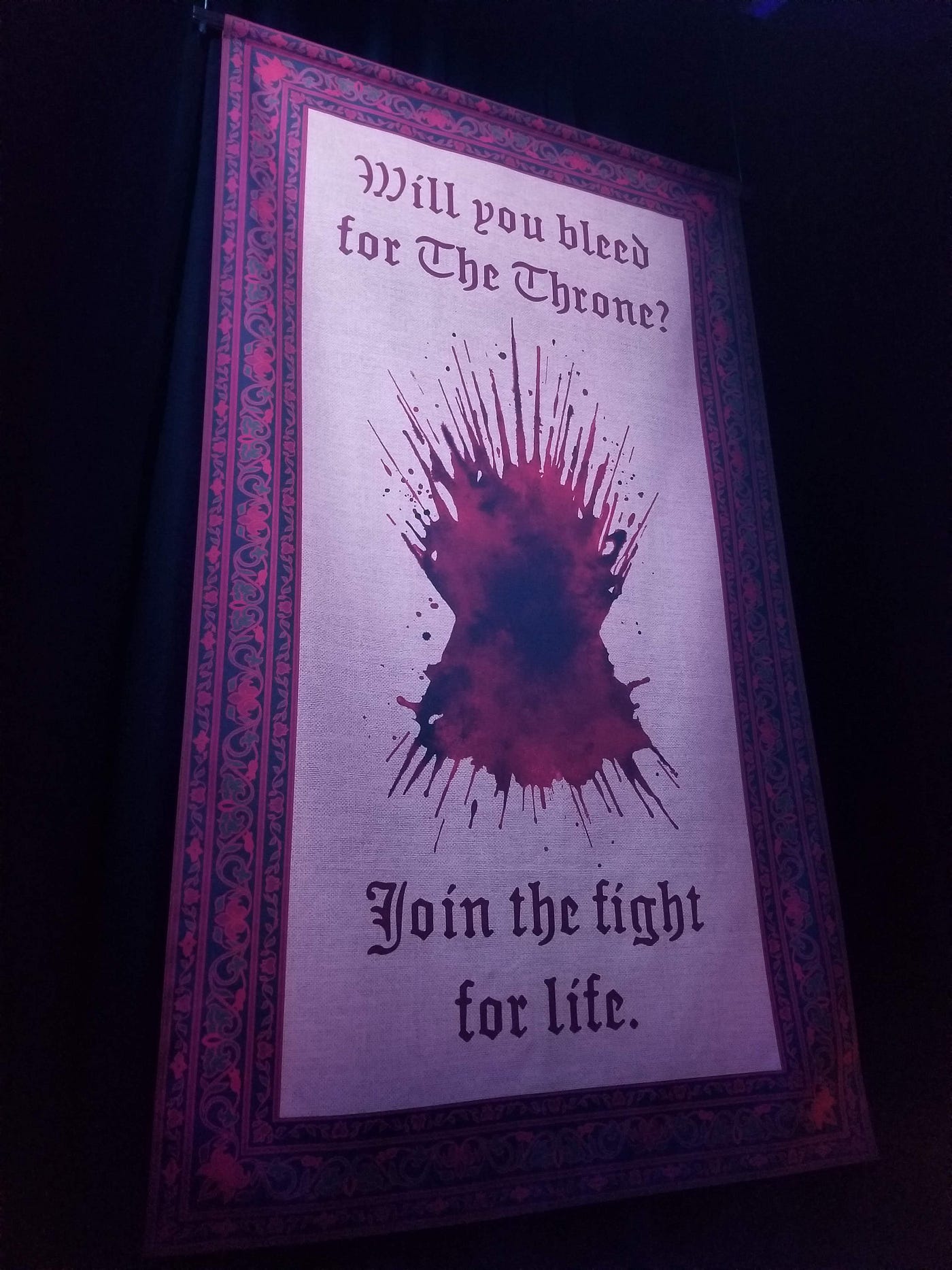 SXSWesteros existed as two experiences, one for blood donors and one for everyone else. This was a great way to drive donor sign-ups, but a bummer for people who couldn’t donate due to medical reasons or because they hung out in Europe for too long during key parts of the 90s. The overall experience was similar: You entered a grand stone hall, at the end of which sat the Iron Throne on a dais, beneath a stained glass window bearing the Red Cross logo. A live choir with musical accompaniment flanked the throne on either side, and sang beautiful arrangements of themes and songs from the series. They did this all. Day. As a donor, you were taken to a red-draped waiting area with high backed wooden chairs, then processed for donation and taken to a back room for the actual donating. Afterward, you were escorted to a donor’s lounge where you drank juice and ate snacks, and were given a t-shirt exclusive to donors. Then, you were escorted to the activation portion.