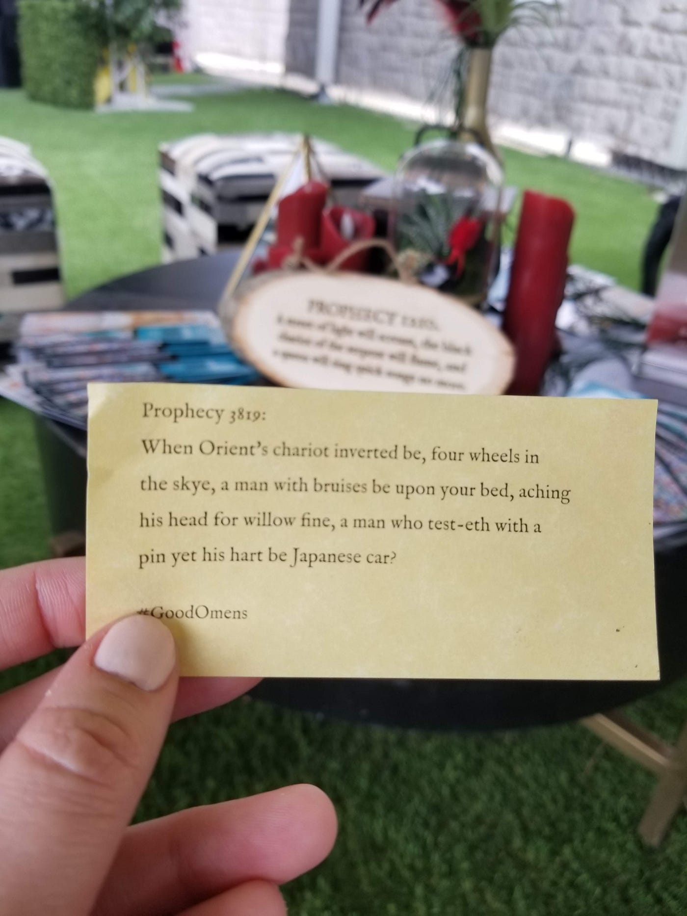 In the center of the space stood a beautiful, massive apple tree, where you could get your own piece of forbidden fruit (a plastic apple) and open it to find a prophecy, just for you (taken directly from the text of the book). The sprawling green astroturf lawn was dotted with places to sit, and thematically relevant set dressing and photo ops. Some were elaborate animated GIF stations, decked out to replicate locations like Aziraphale’s bookstore, or otherwise swathed in green screen drapery. There were two food stands; a wine bar and a beer bar; a Hellhound playpen where one could cuddle adorable, adoptable puppies; a braiding/up-do station; a manicure station; and a main stage area where different acts performed throughout the week, like a Queen cover band, or from which Twitch streamers commanded a life-size game of chess.