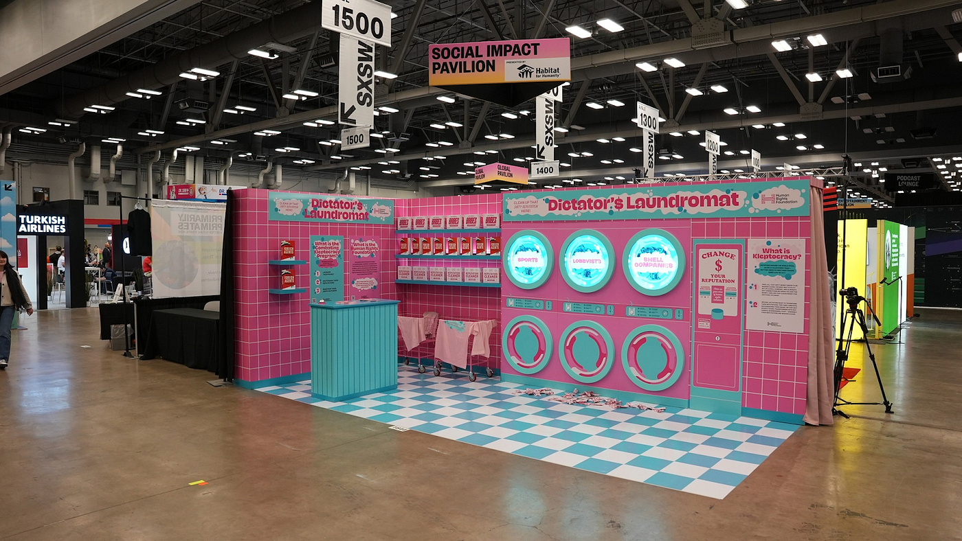 With its bold baby blue and Barbie-pink color palette, The Human Rights Foundation’s Dictator’s Laundromat instantly drew the eye, luring in curious passersby with its vibrant, Meow Wolf-esque aesthetic. At first glance, it appeared to be another Instagrammable installation, but upon closer inspection, the experience revealed itself to be a sharp and effective critique of kleptocracy. The seemingly playful laundromat set-up held deeper meaning — peering inside the washing machines revealed hidden information on the various ways illicit money is “laundered,” while scattered fake dollar bills contained additional insights on financial corruption. The installation’s simplicity was its strength, distilling complex themes into an easily digestible, visually engaging format. By leveraging the way modern audiences interact with visually striking spaces, Dictator’s Laundromat successfully transformed an attention-grabbing design into a powerful educational tool.