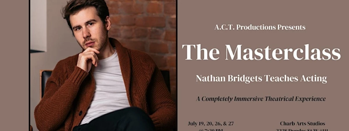 In The Masterclass, Nathan Bridgets (Kyle Claeys), “renowned” Canadian actor, producer, director, theatre practitioner and author of the best-selling novel “An Actor Does NOT Prepare”, invites the audience to his studio for a unique acting class. The setting is intimate — a small room with around two dozen chairs set up in a semi-circle. An immobile Bridgets is sprawled dramatically on the ground, emerging only once we’re seated in place.