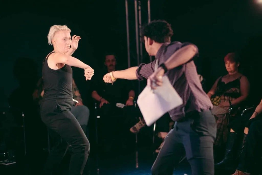 As an actor, Carding is incredible. Their fluency in the rhythm of the Shakespearean language and ability to control the room through sheer presence is stunning. Carding’s Hamlet is a twitchy, self-absorbed force of chaos that manages to inspire both sympathy and frustration. But the structure of the show is just as solid. Carding has given the audience just enough simple actions and lines to be a potent sounding board to their dramatic performance, and that both reinforces the theme of the work (that everyone is a pale shadow in the face of Hamlet’s internal struggle) and brings a fresh perspective on the play by allowing you to view it through the eyes of other characters caught up in Hamlet’s destructive wake. I have certainly never wanted Hamlet to shut up so badly before I had to listen to him as Laertes.