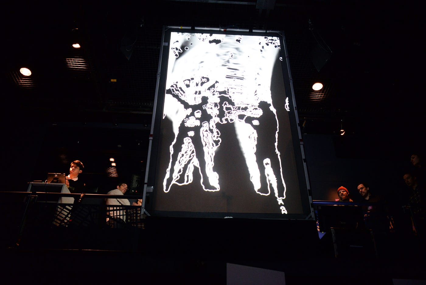 BAM Fisher’s flexible main stage holds the larger interactive pieces. Some of the exhibits I walk by are Max Björverud’s “Light Pong,” Compagnia TPO’s “Colors,” “Figuration” from Masary Studios, and the marvelously titled “Ghost Sine” by Christopher Short. All of these pieces use interactive tools, light projection, body tracking, pressure sensors, or more conventional user interfaces to get the participant involved in the piece.