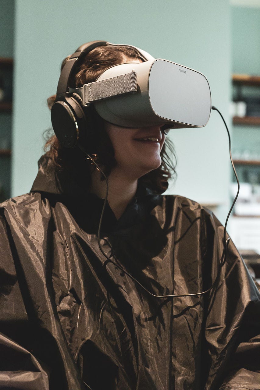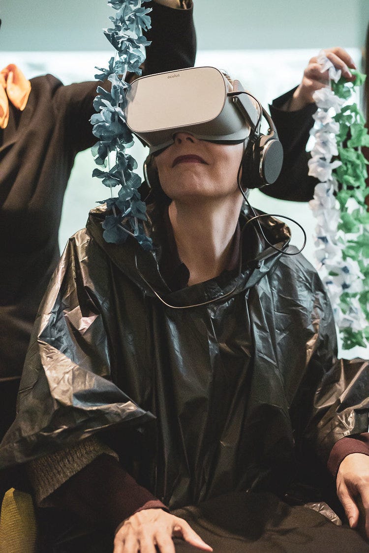 When we’ve finally secured our headsets we are each handed a controller and instructed how to trigger the “start” of the experience at the same time as our other travelers, and then are advised to return the controls to our hostess once it’s begun. She counts us down and we engage; once the “travel” portion of the performance has commenced the actors are forgotten, as the sensory engagement takes the center stage. Vibrations, sounds, smells, touches, and even tastes are offered up as the digital environment changes around us. In the course of only ten minutes we’re spirited around the world; a 360-degree visual of several locations feels lush and all-encompassing. There’s a field of flowers that smells like spring, next a breezy glen, then there’s damp spray whipping up against my neck at the beach, shortly followed by a dazzling canopy of willow fronds that drape and tousle in my hair. As a passionate fan of ASMR I’m enchanted; during one scene, I actually feel genuine pangs of homesickness as a woodsy campsite materializes around me and I smell cedarwood and hear the twangy pluck of a banjo.