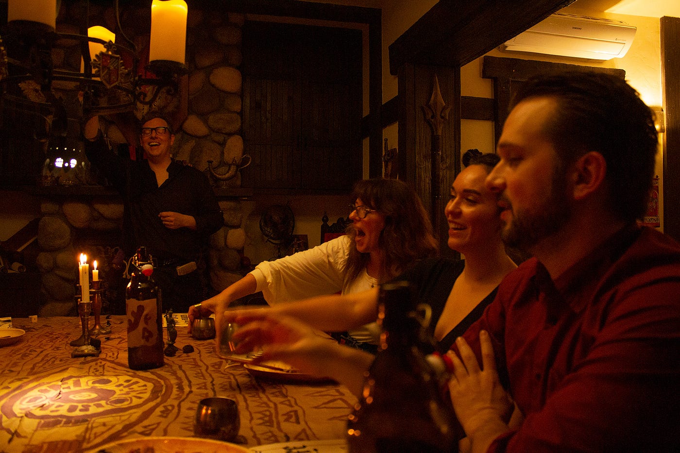 The lavishly themed bacchanal features meat or vegetarian and wine or mocktail for a $145 donation that includes tax and gratuity. Intimate (with just twelve road-weary strangers per seating) and highly collaborative, the experience lasts up to 3 hours. Banquet at a communal kings-table hosted by a gregarious innkeeper with a horrible secret.