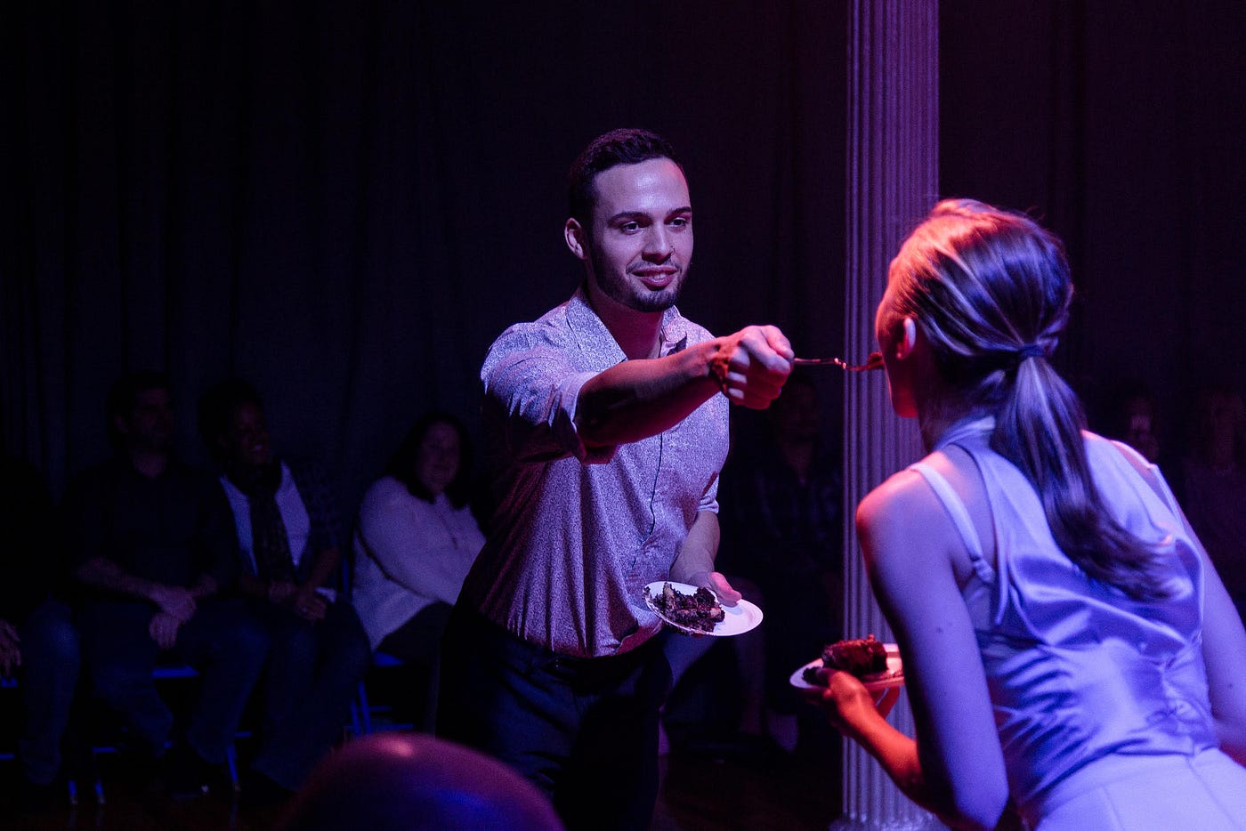 The show alternates between staged dance pieces and opportunities for the audience to mingle and interact, typically staged around rituals of a party — opening remarks, a toast, a cake-cutting. All of these provided opportunities for food or drink. Small bites were passed during the staged dancing, while the champagne toast and cake-cutting had obvious edible components. The snacks and sips were more than just a bonus though. They effectively transported the audience into the world of the party. Being forced to compliment the deliberately cloying cake when confronted by the dancer who had brought it and then gossiping about its low quality with the other guests dragged me into the world of the show. The hors d’oeuvres and drinks worked just like they do at a real party, a tasty bite, as well as a conversation starter when banter hit a lull, and a conversation stopper when a guest or host became uncomfortable enough they wanted a quick exit.