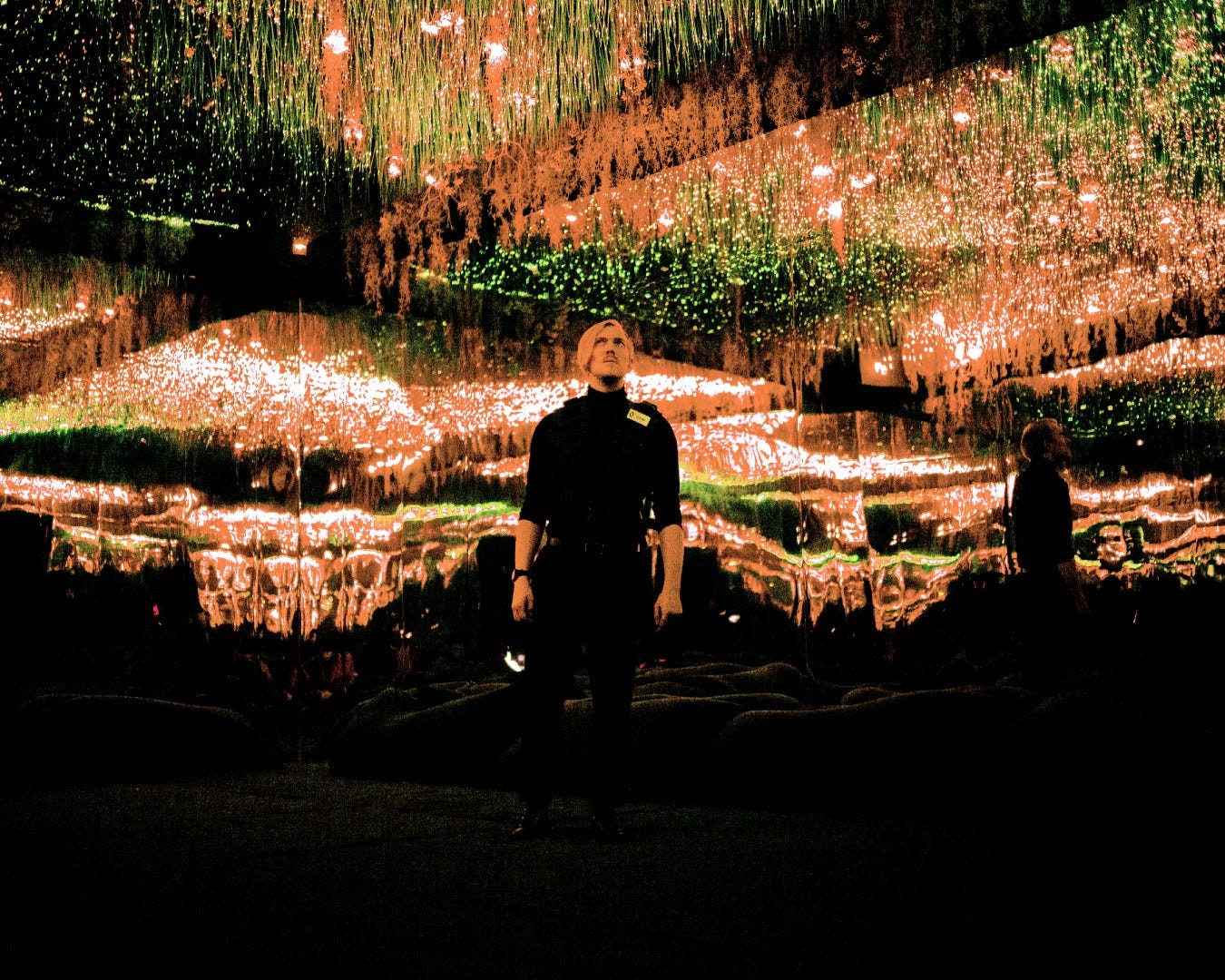 The tone of the experience proper is completely different from the opening scenes. Attendees enter an enormous, lushly lit sandbox space with freedom to roam and encounter both installations and performers. The immersive installations are pretty, but feel uncurated, lacking a real narrative function or cohesive theme in the space. My favorite by far was a mirror room, with the ceiling covered in pulsating luminous fronds of LED lights. The ground was entirely astroturf, and patrons laid back and watched the digital stars flicker. It was a tremendously satisfying sensory experience, almost a visual/tactile equivalent to ASMR, but like all the art, didn’t seem connected to the story. As for the performers, the “aliens” would occasionally do an otherworldly “courtship” dance with the patrons in one of these installations, which blended in well with the tone of the intro, but then, in the spaces in between exhibits, the actors playing government agents would slam themselves against the walls in synchronicity, writhing about, eyes darting, appearing to be possessed.