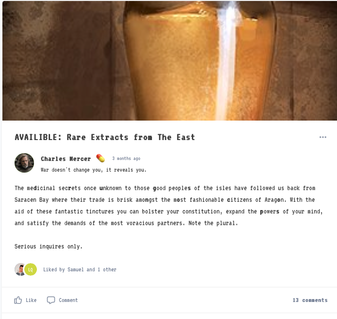 With the first news drop the table setting of the world began, and the tone was more broadly comic than what the emphemera implied, although still shot through with a bit of melancholy. Some of this was due to placing our characters in the midst of a pandemic and under their own form of lockdown. “The Wires” were a diagetic way of explaining the need for message boards and the Gather platform, but it robbed some of the romance of being in a Robin Hood world. Our character’s lives were overlaid with our own in such a way that raw escape would never be totally possible.