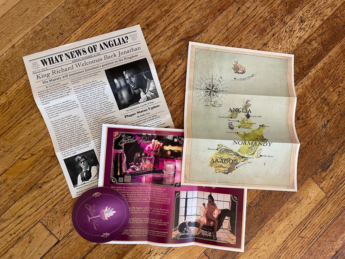 A few days before launch of the online platform a small care package filled with ephemera — a “newspaper” consisting of two pages complete with a crossword and jumble puzzle, a map of the local world (Anglia, Normandy, and Aragon), along with a coaster from and brochure for Baroness Serena’s Crystal Room featuring the burlesque talents of Miss Eliza Wolfe — arrived by hand delivery.