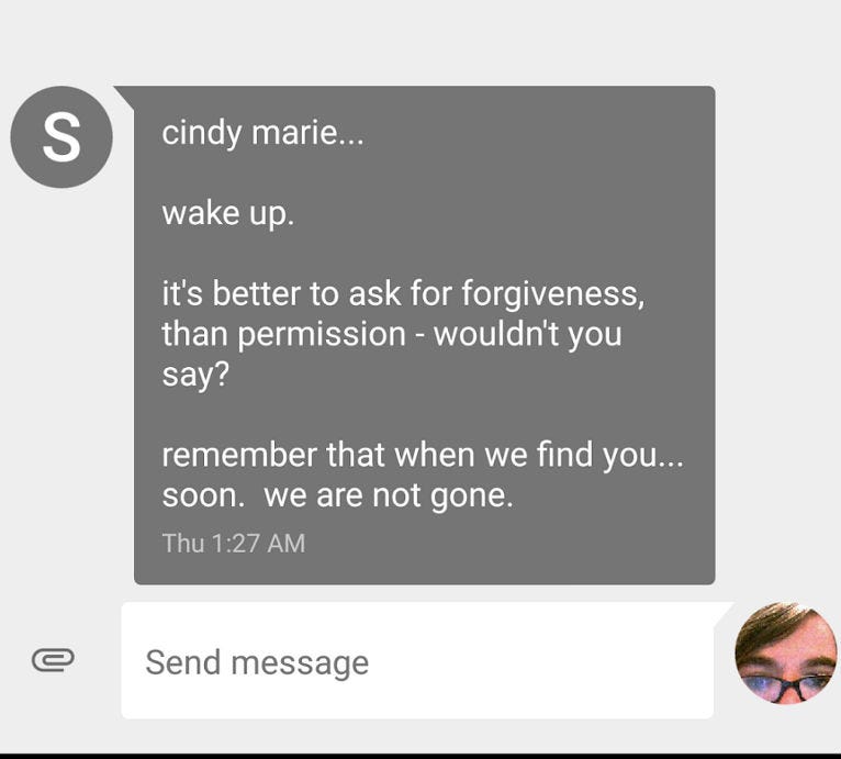 As you can see from the text screenshot above, there was no further information. Even if they had signed it “Selena,” that would have given me a clue that it wasn’t some anonymous burglar/rapist waiting outside my window until I received the message before terrorizing my family.