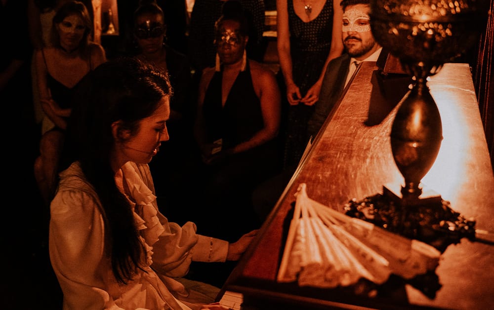 One of my favorite moments that you didn't hit on was actually the opening. I loved that after the formal onboarding, there's a moment where it's kind of like a cocktail party. They give you a glass of champagne, or a non-alcoholic option, and you're mingling, and you're listening to a violinist, and it's really lovely. And then that sequence follows, where you get to meet one of the characters, you get a little bit of interaction, you get to do a little bit of dancing, and then, this is a spoiler, suddenly the doors open up behind you. And this was like my show-stopping moment, right at the top for me, because I was right in front of the doors, and they opened up behind me, and I was face-to-face with a performer belting “Masquerade” and it was so magical! I knew exactly what this was from that moment on, and that whole scene is great too. They really set the tone, and there's a lot of festivity to it that felt really special. It’s just a lot of fun. That’s definitely my favorite moment.