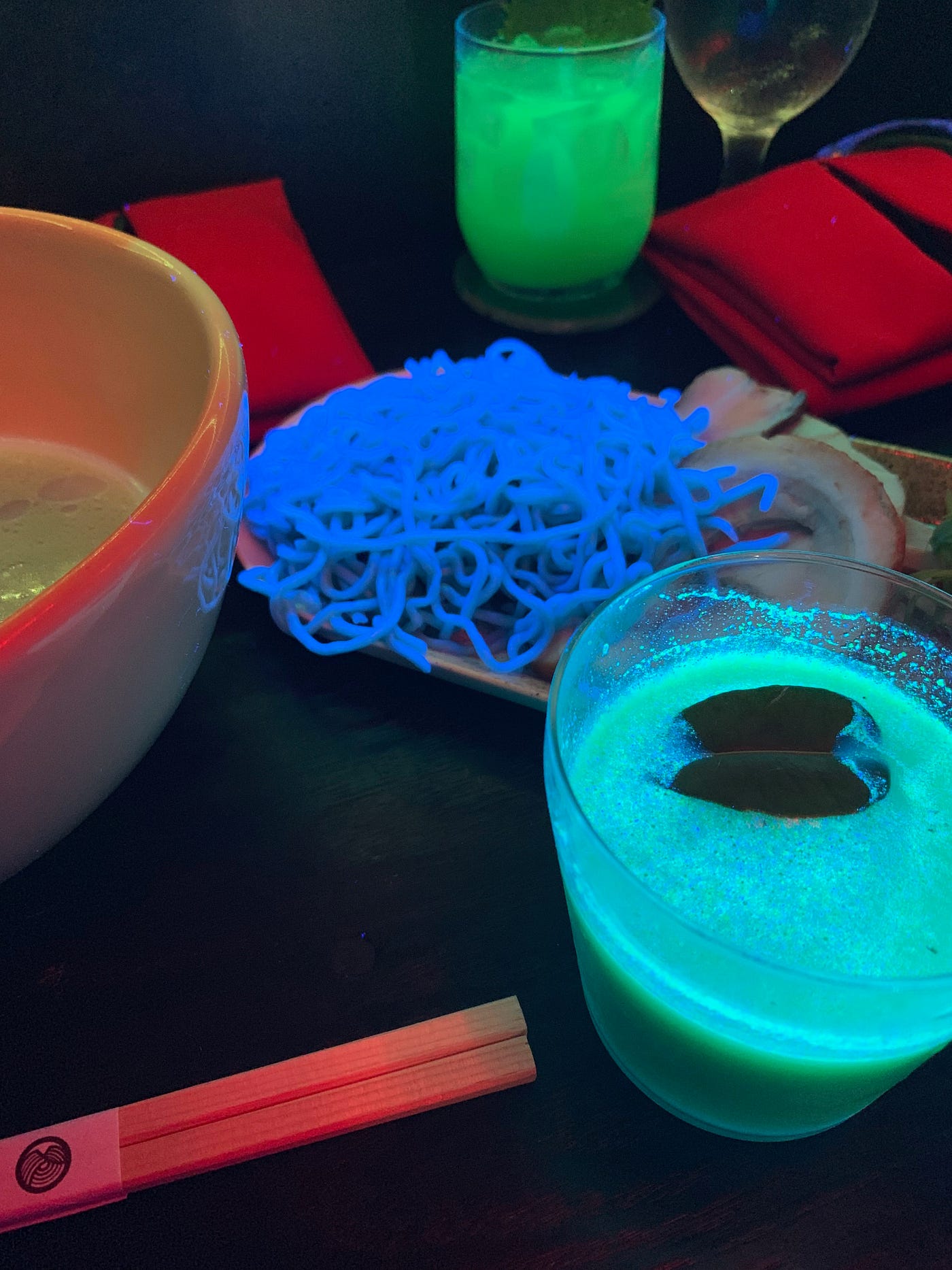 While I half expected the food to lean more to the novelty side, it was a tasty bowl of ramen. I was able to try two of the three options the kitchen had on offer and they were both distinctive, glowing twists on the dish. The standard ramen has a salty broth that works in tandem with the BBQ pork and outstanding fish cakes. The other comes with a richer, more umami flavored broth and an exceptional shrimp dumpling that only glows once you’ve exposed the delightful filling.