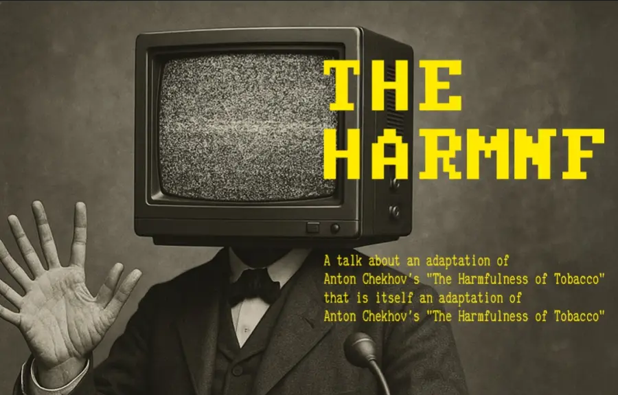 In The Harmnf, he attempts to deliver a lecture on that failed experiment—just as Chekhov’s hapless lecturer once tried (and failed) to give a talk on tobacco. What unfolds is part confession, part comedy, and part philosophical meltdown: a live show presented as a talk that keeps derailing into questions about creativity, collaboration, and the inevitability of humanity's continued monopoly on art, despite the technocratic set's best efforts. Performed with slides, a "trusty" laptop, and a VR headset connecting to a simultaneous virtual audience, The Harmnf is equal parts stand-up, academic farce, and existential tech demo.