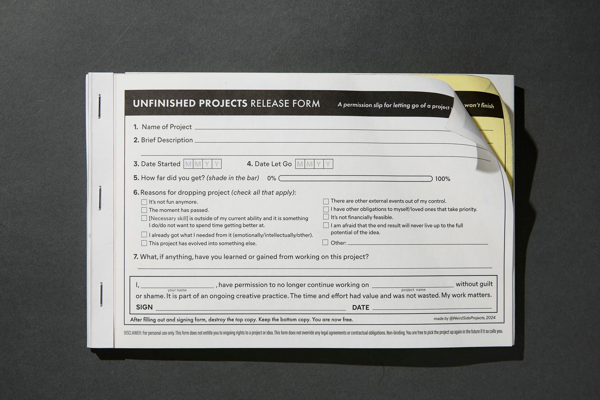 Well, this holiday season, give the gift of letting go with some Unfinished Projects Release Forms by artist April Soetarman. The form is a two part carbonless slip which acts as a permission slip for letting go of a project you’re just not going to finish.