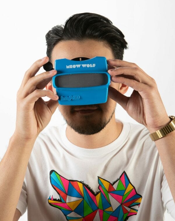 One of my favorite souvenirs from my various Meow Wolf trips is a View Master-like device called the Vista Boss. (In fact, I have three of them currently sitting on the shelf next to me: one for each location I have visited.) The Vista Boss is a handheld device which allows users to view stereoscopic 3D photographs when they hold it up to their faces; in this case, the viewer can see tiny slide photographs of different exhibits within The House of Eternal Return or Omega Mart, for example. Each viewer comes with two cardboard slide reels which get inserted into the plastic viewer; depressing on the mechanical lever advances to the next slide. Basically, like having a little piece of Meow Wolf in your home, allowing you to escape to the “Glowquarium” or “Brrrmuda” whenever you want. And pushing down on that plastic lever to get to the next photograph is just really, truly satisfying. Ker-chunk!