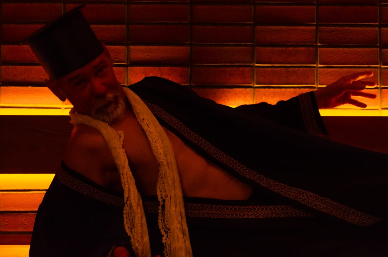 Hope Youngblood and Ashley Brett Chipman: This experience is about dragging Rasputin’s myth out of the history books and sweating it back into the body. It unfolds inside a real working bathhouse—sauna, cold plunges, showers, tile, heat—and the audience free-roams through the space in towels and swimsuits as the story erupts around them. There’s no stage. Rasputin appears, disappears, resurrects, seduces, and refuses to die while you’re actively sweating, shivering, and breathing beside him.