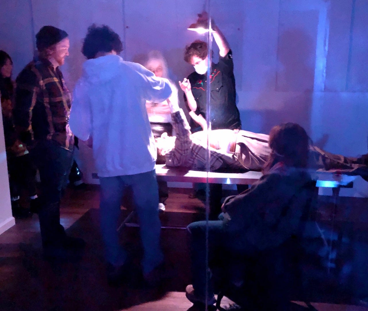 TN: Our initial inspiration was the venue, The Lower Case, an immersive arts space cofounded by Dustin in 2022. He wanted to do a show that transformed the space and took advantage of its interconnected rooms. We began experimenting with the idea of an audience using flashlights to direct the action. This was partially inspired by Dustin’s past work, The Aluminum Cat, an online show (in 2019, pre-pandemic!) where the audience communicated with actors using only their mice.