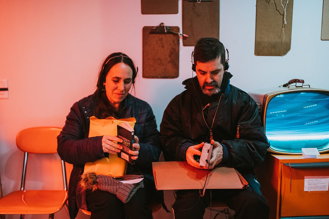 The evening is actually in two parts: the first hour is a self-directed exploration of a waiting room staffed by a silent, looming Operative in white. One is asked to complete an intake form and then occupy one’s time: