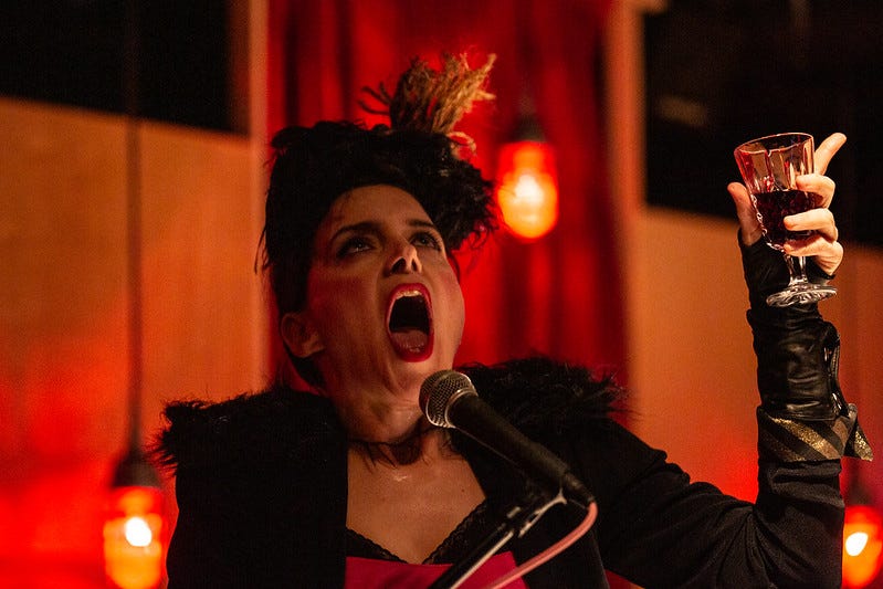 Set in East Village theater The Collapsible Hole, Now Serving invites audience to come early to enjoy complimentary cocktails, including “The Dirty Drip” (a vodka punch circulating through a light up fountain) and a “Mystery Shot,” as well as light hor d’oeuvres. I receive a small plastic shell with the number “2” written on it from the person behind the box office desk, who was sporting a mouse nose mask (not to be put to shame by the bartender’s matching pig nose piece). I wait for my number to be called on the “Now Serving” sign above the doors.