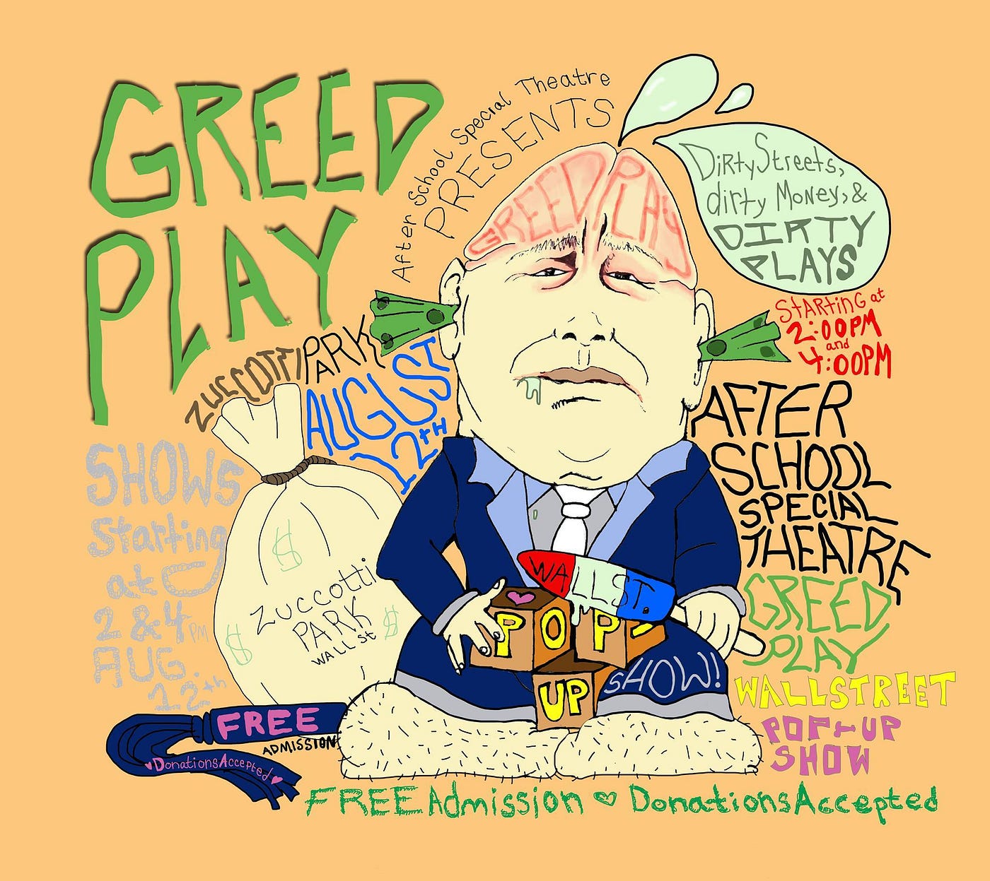 “Are you a whore for politics? A maniac for disorder? A John Waters glutton? Or just a total freak? Then After School Special Theatre’s GREED PLAY is the show for you! GREED PLAY is cumin to wreck haveck on WALL ST August 12. That’s right people- Wall St. — the place pigeons go to die.
