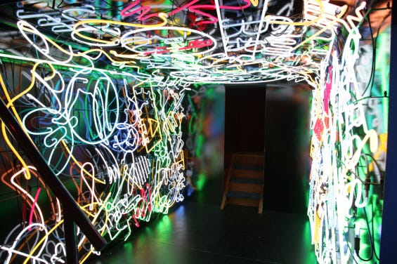 Content Advisories: This exhibit is not for all audiences; it contains steep staircases, uneven and soft floor surfaces, small and narrow enclosed spaces, and blinking neon lights.