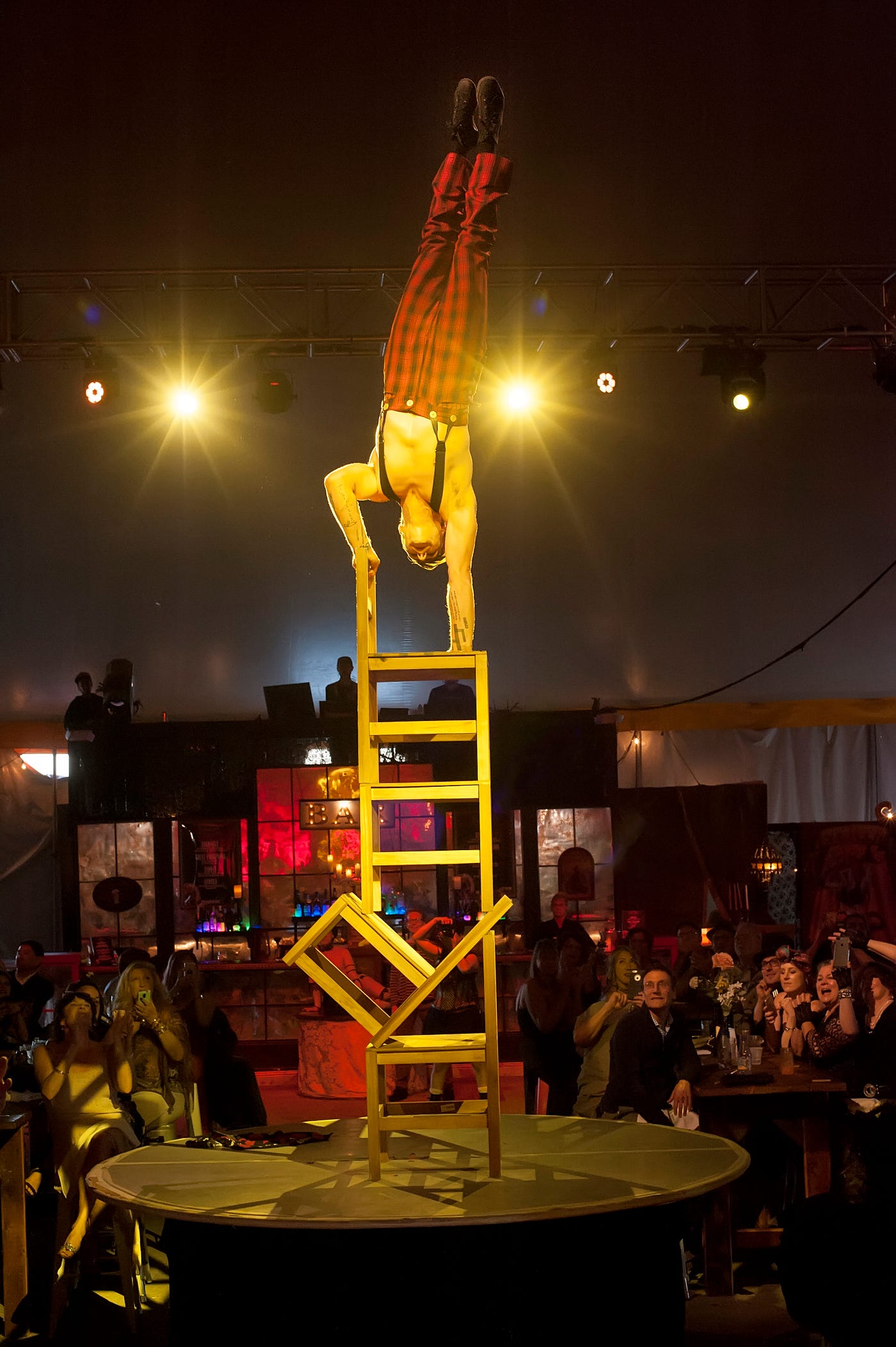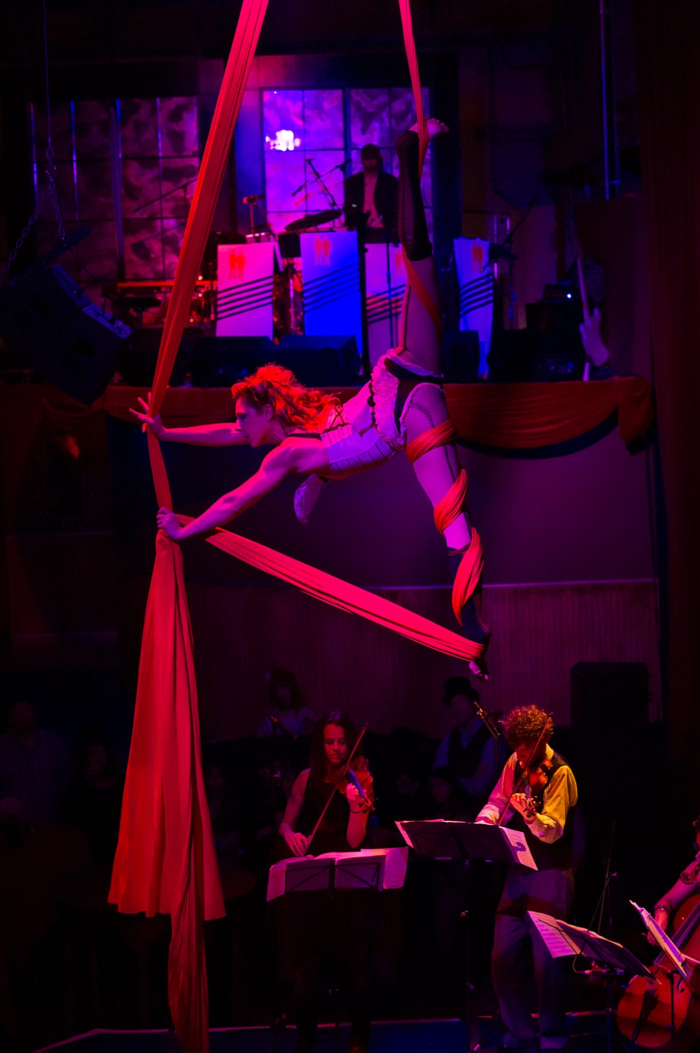 I settle in for that most time-honored of dramaturgical traditions, dinner theater, but it’s quickly clear the experience will be anything but traditional. As I work my way across the venue, I sample the multitude of enjoyable hors d’oeuvres passed to me by cast members fully invested in character and clad in their finest turn of the century burlesque. As the audience mingles and nibbles, the cast works its way to the stage, and several acrobats, dancers, and stunt artists perform as the talented Casa Nosa Strings play throughout dinner. The evening proceeds with a four course dinner from Work of Art catering, including a particularly delicious heirloom tomato salad course, as well as a cash bar. It’s worth noting, while tickets can be bought for the performance only, several acts do perform during dinner and are not repeated during the main show. An unofficial survey of the space revealed a mostly full tent for dinner, and those who opt for the performance-only ticket may find their options for seating somewhat limited.