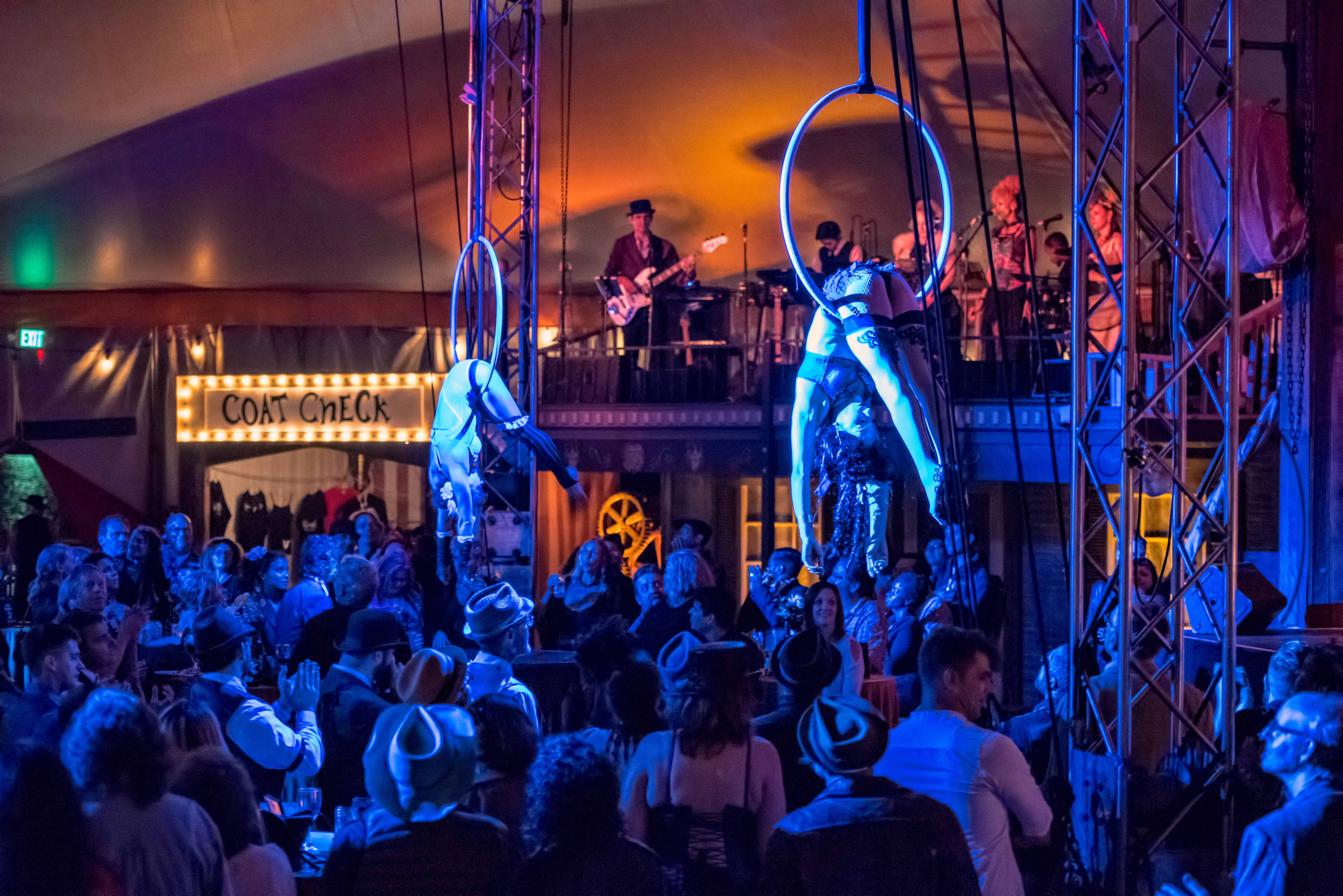 As the s’more custard dessert was cleared, the main act began. The Jazz Mafia took to bandstand and a spectacle of burlesque, acrobatics, and dance began to play out all around us. While a large portion of the action takes place on the main center stage, performers could be found on a raised platform at the center of the tent, on staircases, dangling from the ceiling, and even on the bar. A second elevated stage housed the band, though it was no surprise to find musicians appearing throughout the tent, and a third platform was decorated as a Gilded Age bordello, home to the eponymous “soiled doves.”