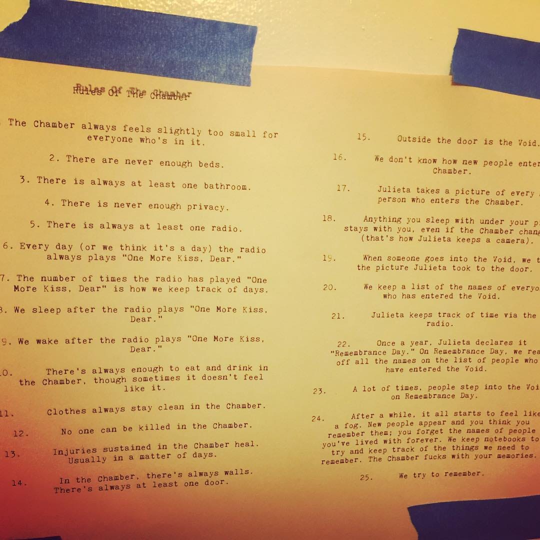 We awaken in a mysterious Chamber, a room that changes design and its contents every day. We don’t know how we got here, or really how long we have been here. A radio is always present, and it is through the radio that we have been trying to keep track of time. The song “One More Kiss, Dear” (which I recognize from the film Bladerunner) is a constant on the radio. We use it to signify the start and end of the day. We can not die, we can not be hurt, the only way out of the Chamber, is the door.