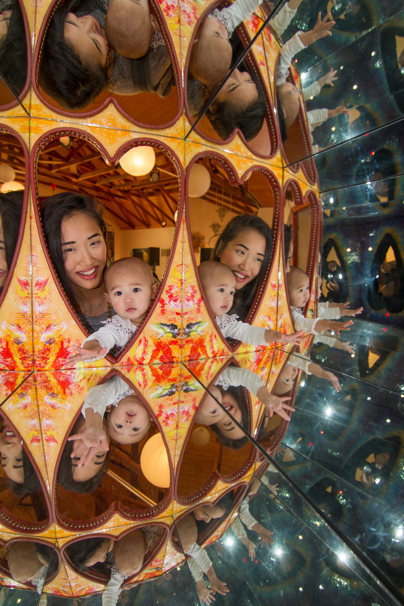 Some exhibits announce themselves boldly and clearly up front. The “Kinetic Infinity Room” encircles guests behind closed mirrored doors for one of the more exhilarating visual experiences of the exhibit. Still, it’s tempting, as one wanders from space to space, to superficially observe the exhibits. On the surface, the space is an amalgamation of video screens and LED lights, which to the casual observer, seem pretty but simple. Yet, much like Unreal Garden, when one takes a moment to engage with each piece, subtler and more exquisite details are brought forth, and the integration of the visitor can be appreciated more fully. Step inside a large LED sphere and watch as it responds as you breathe. Digital worlds of organic and oceanic environments respond and grow in response to your physical presence. Take a seat in an elven throne, and watch as the forest world around you activates and grows in response to your heartbeat. Children can play in a digital forest, rerouting an electronic waterful with their bodies or with tactile logs, while their parents or guardians watch the ecosystem around them grow in response. Sit back and listen or engage with touch responsive fabric that creates orchestral music in collaboration with your fellow participants.