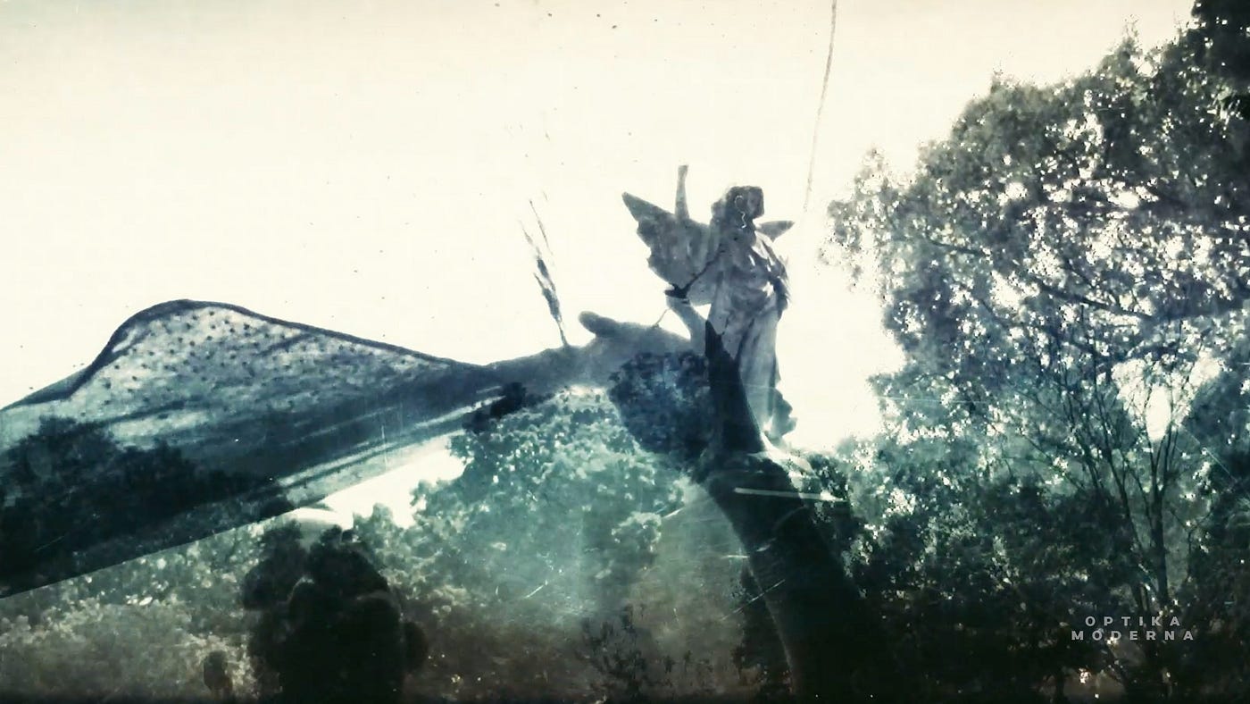 Next, I watch a series of music videos on my smartphone, delivered through an unlisted Vimeo page. The playlist begins with a first person experience reminiscent of a Sleep No More one-on-one. I see a female optician shining a light in my eyes through the screen as glitch lines and computer text a la The Matrix begin to flash on the screen, with thrumming techno in the background growing ever louder. I enjoy it well enough, but the video’s visuals transition into mumbly new age chatter over abstract dancing soon after. But wait! Just as my mind is starting to wander, I see a surrealist tableau of a man frollicking through an industrial space, after seemingly ingesting a hallucinogen. Then: twin angels sending my message to heaven tied to balloons! I cringe a little and am reminded of a condolence card come to life.
