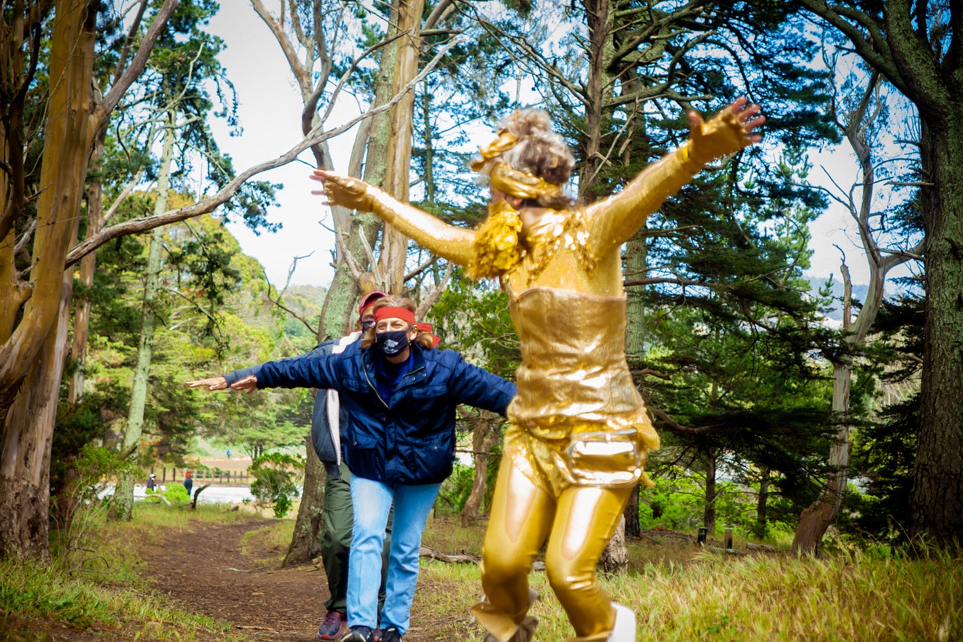 It seemed a foregone conclusion — could PSYCHOPOMP happen anywhere else? Certainly not. Fortunately though, this was not solely due to pandemic necessity, but also because McLaren Park was as much a character in the production as any one of the skilled, enthusiastic, colorful cast of characters I met along the way. The idea that site specific theater would incorporate its location so well in its production is certainly not novel, but as we emerge from this period of outdoor-by-necessity, the idea of going outside didn’t register as a choice. The last few months have been so preoccupied by a thrilling return to the indoors — bars, theme park rides, theater — that choosing to take an audience on a walk through a park struck me as a particularly mundane concession to a world on the brink of normalcy but still struggling to cross the finish line. I was excited to experience theater again, but dreading the venue.