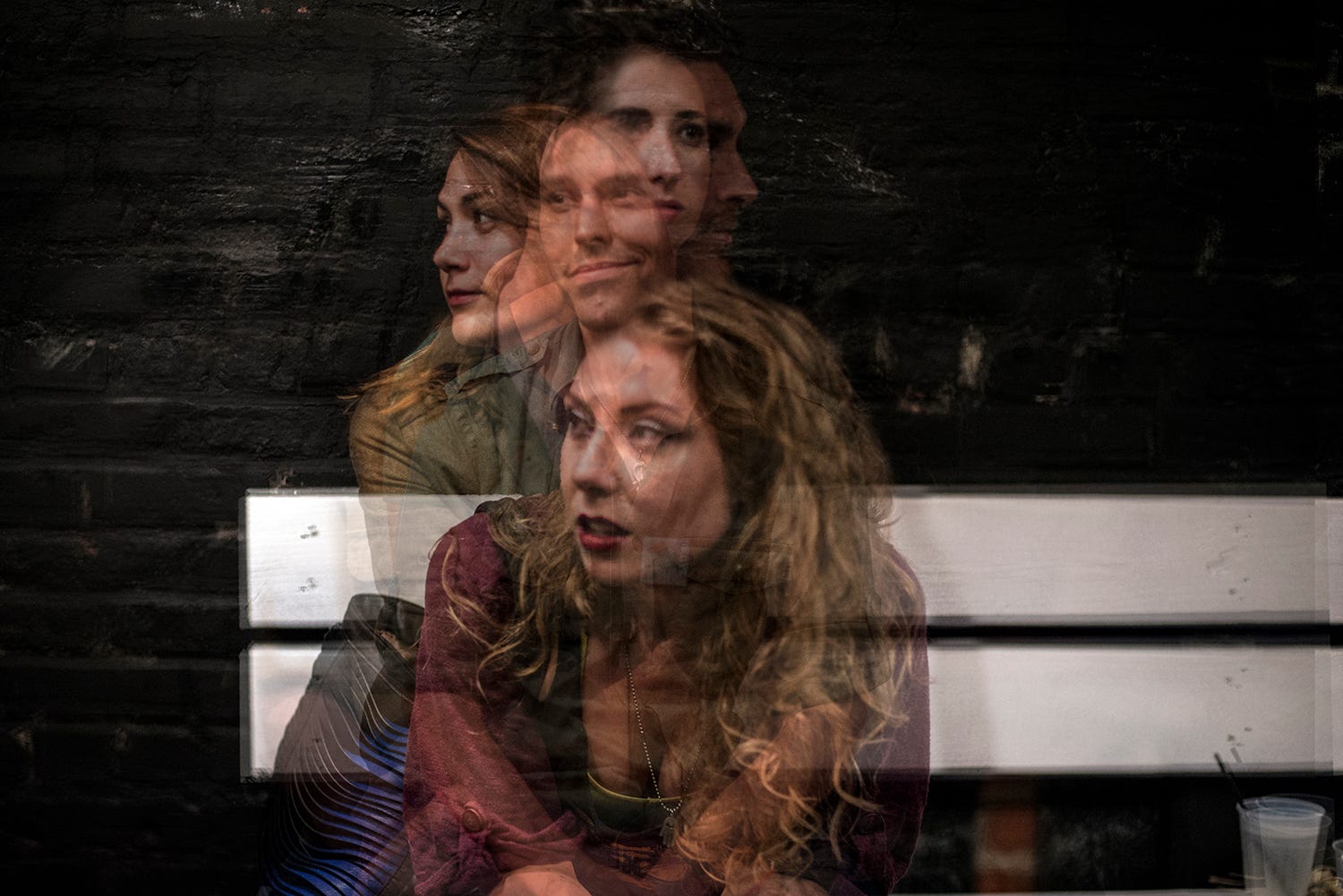 Sixteen chairs are arraigned around a room lit by photography lights. Eight audience members are let into the space, and each is free to take a white chair. This is where they’ll be sitting for the duration of the show. Each of those chairs is paired with another, and the cast will take turns in those chairs as the show progresses.