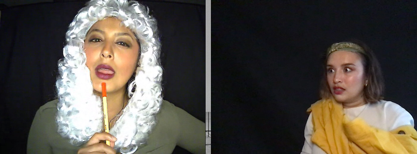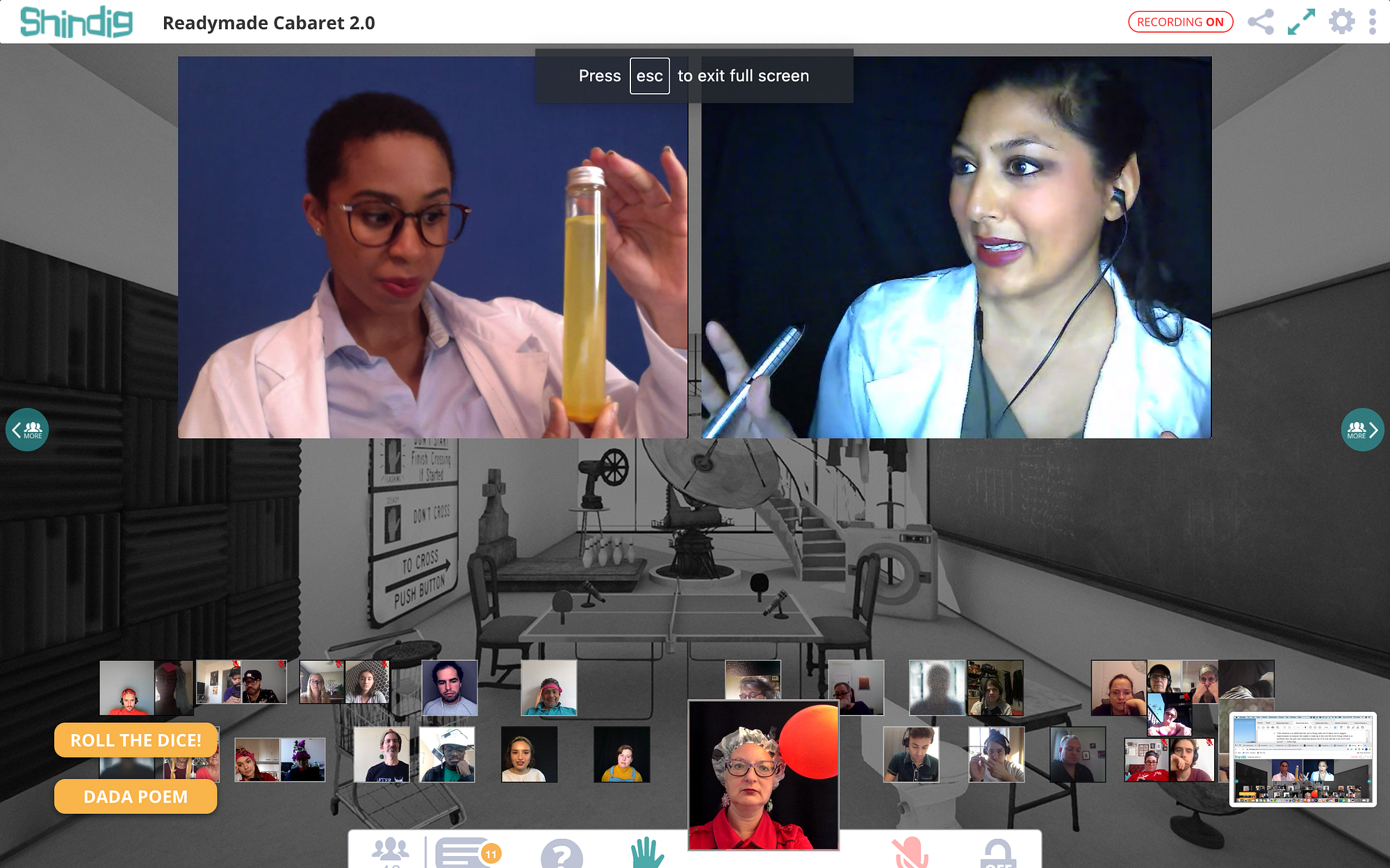 Taking inspiration from our avant garde ancestors, the content of Readymade Cabaret 2.0 is rooted in the Dadaist conundrum that everything is incredibly meaningful and meaningless at the same time, which feels particularly right given the current state of the world. Using a format akin to The Neo-Futurists’ Too Much Light Makes the Baby Go Blind, audience members who raise their hand are called upon to join the virtual stage and roll the dice (or, rather, click the lozenge in the lower left corner of their screen to generate virtual dice) to determine the order in which the night’s scenes will play out. Once a scene is selected, the appropriate performer Shindig squares are brought to the stage and the action unfolds. With moments ranging from traditional proscenium scene work and pre-filmed segments to improvised movement and screen shared presentations, the night is full of unpredictable variety. Readymade Cabaret 2.0’s subject matter covers first dates, lab rats, university lectures, and more. Like any good, well-conditioned theatre goer you may be wondering, are the scenes connected? Perhaps, but really who’s to say considering the point of Dadaism is there is no point…or is there? The material is simply presented and the connections are left for the audience to make or not make at their will.