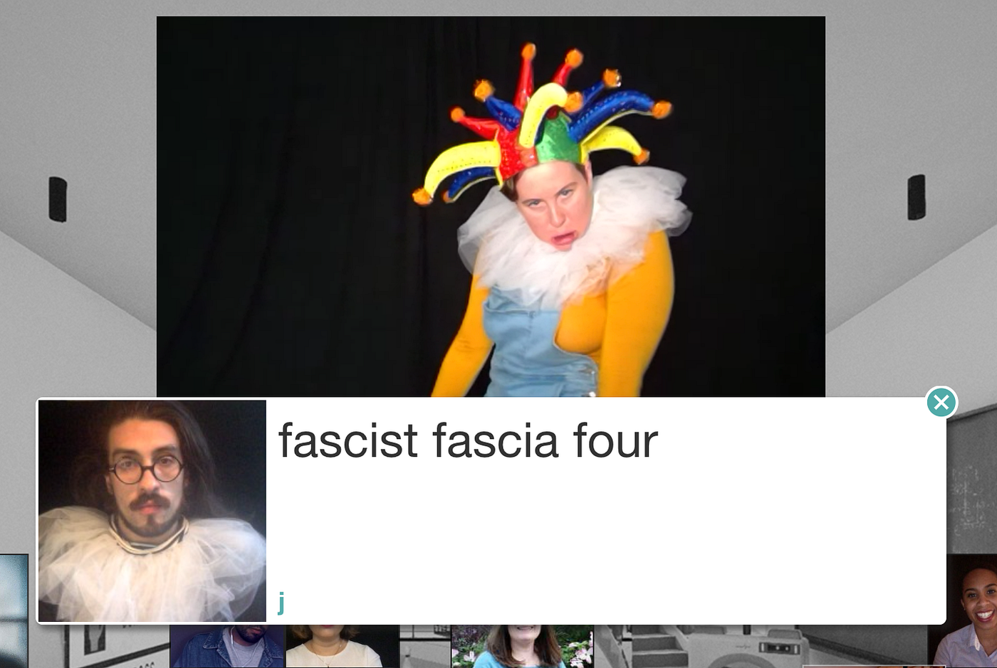 The idea of readymade was also present in the artistic content itself. The scenes obviously were taking place in performer’s homes and not in a grand, designed environment or theatre, so various pedestrian settings and makeshift props and costumes felt on theme with the overall concept. Some of my favorite genres of scenes in this piece were the “Chance Dances” and “Aleatory Compositions.” In these similarly structured segments, a single performer entered the stage and the audience was instructed to enter suggestions into the question box on their screen such as a body part, a verb, and a number of repetitions or an object, a body part, and a way to play said object. The performer then created a movement or sound piece in real time using the audience suggestions, sort of like a Mad Libs-generated version of choreography or composition. This framework felt goofy in theory, but the performers were so committed and creative that these moments felt heightened, purposeful, and dare I say, artistic.