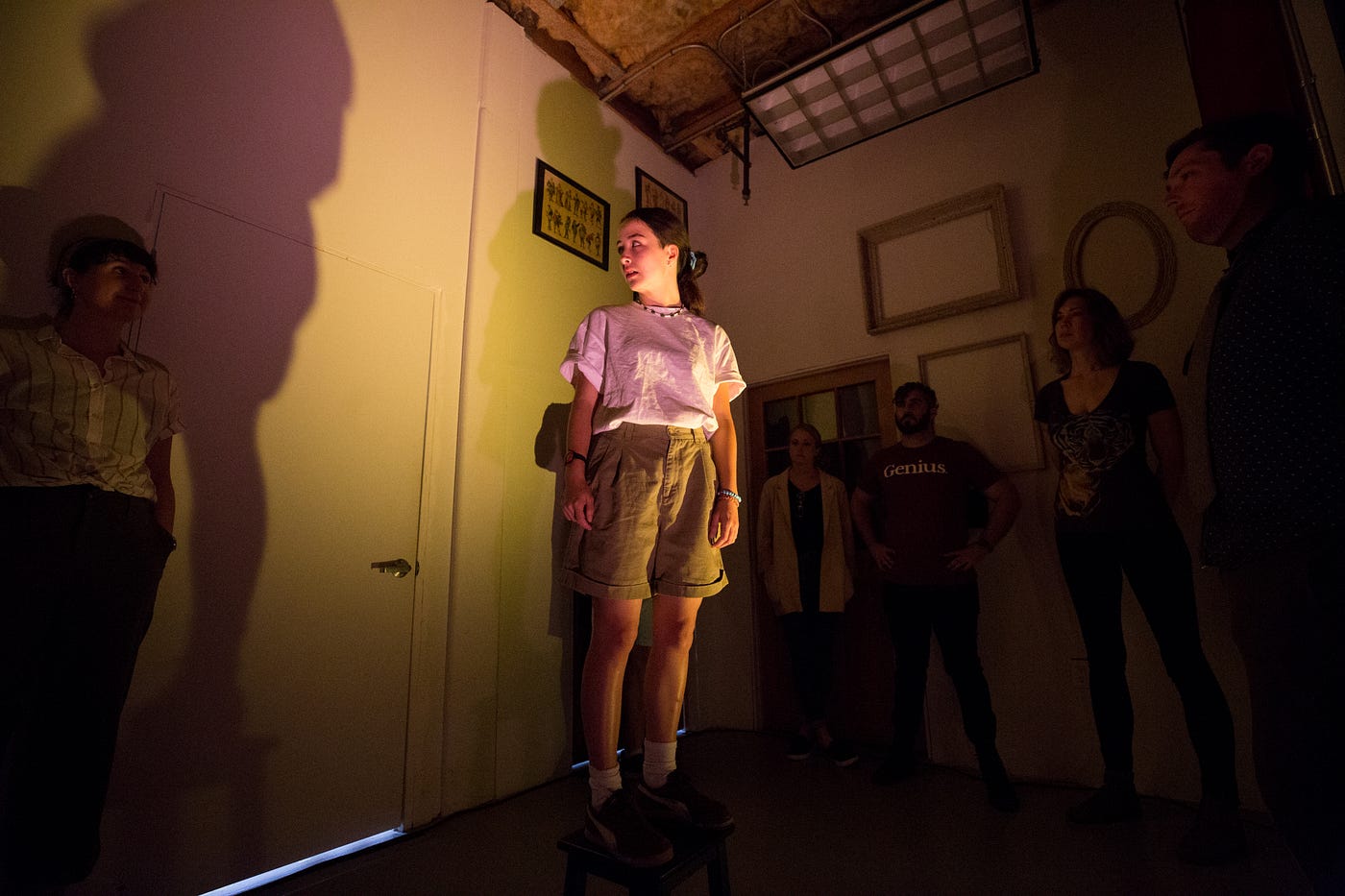At first there’s just a girl, standing on a box in a dimly lit vestibule.