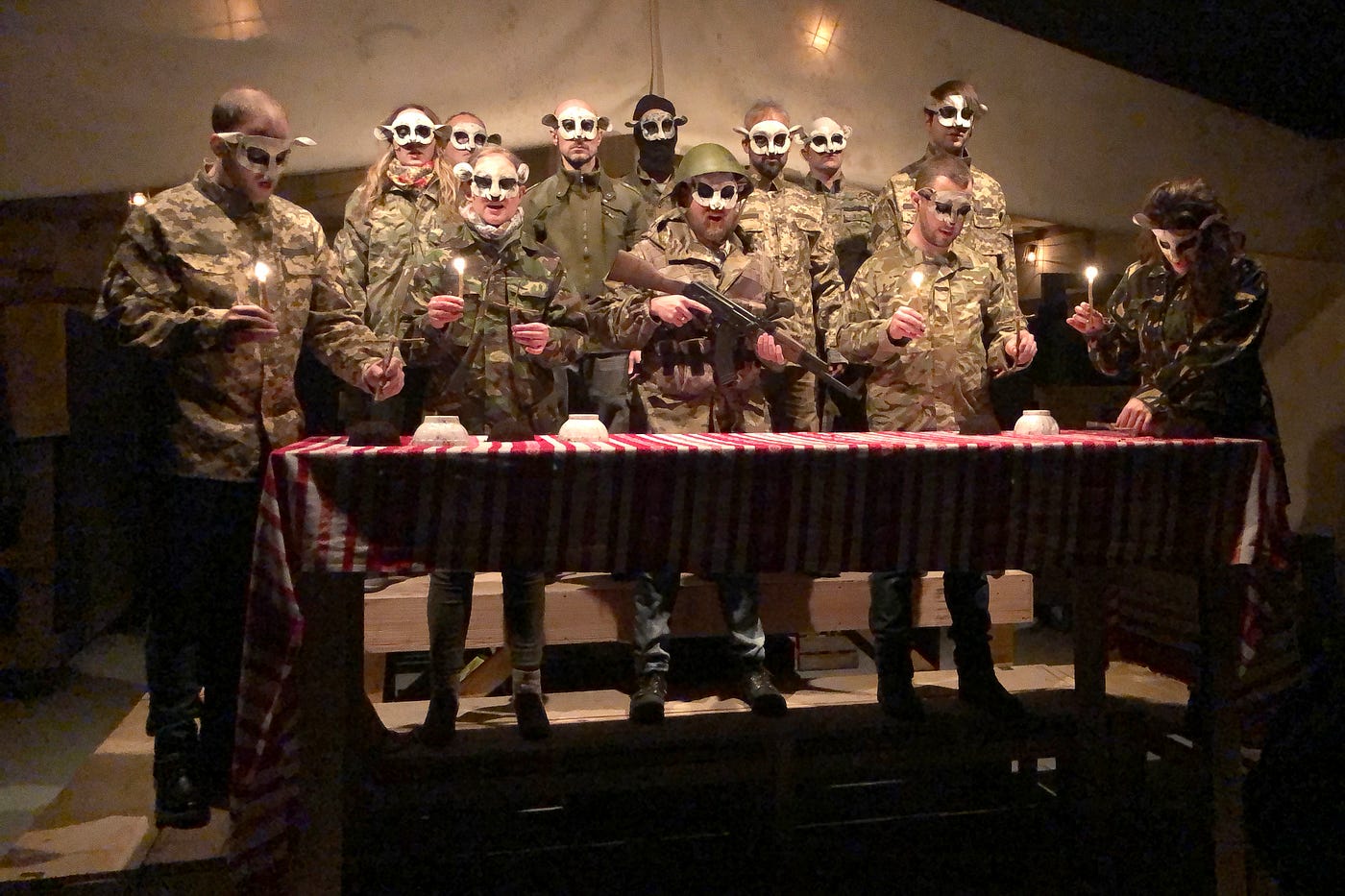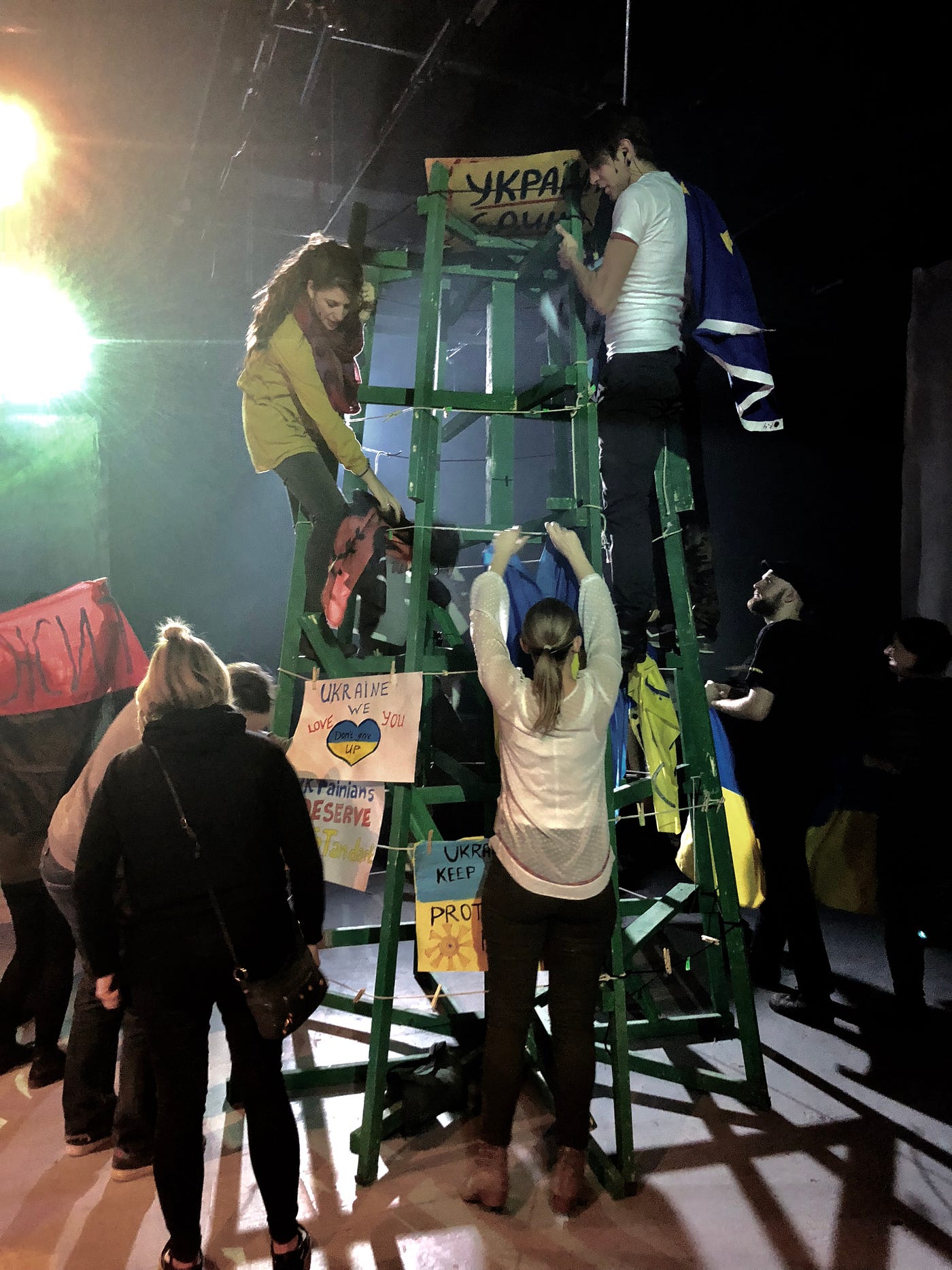 I am first seated on a wooden bench but quickly am taken by the hand and given a flag to wave. I dance down the dinner table, lead by a cast member, as the merry group parades past the seated attendees. The performers are tenacious in coaxing participation from the crowd throughout the show — everything from assembling first aid kits, throwing bricks (actually painted foam) at police in riot gear, cutting blue and yellow ribbons to pin on fellow protestors’ chests, or even learning the words to a protest song from a handout, lyrics in both English and Ukranian, thankfully. Even those up in the bleachers are encouraged to move around during the show, get up, eat, dance, and sing.