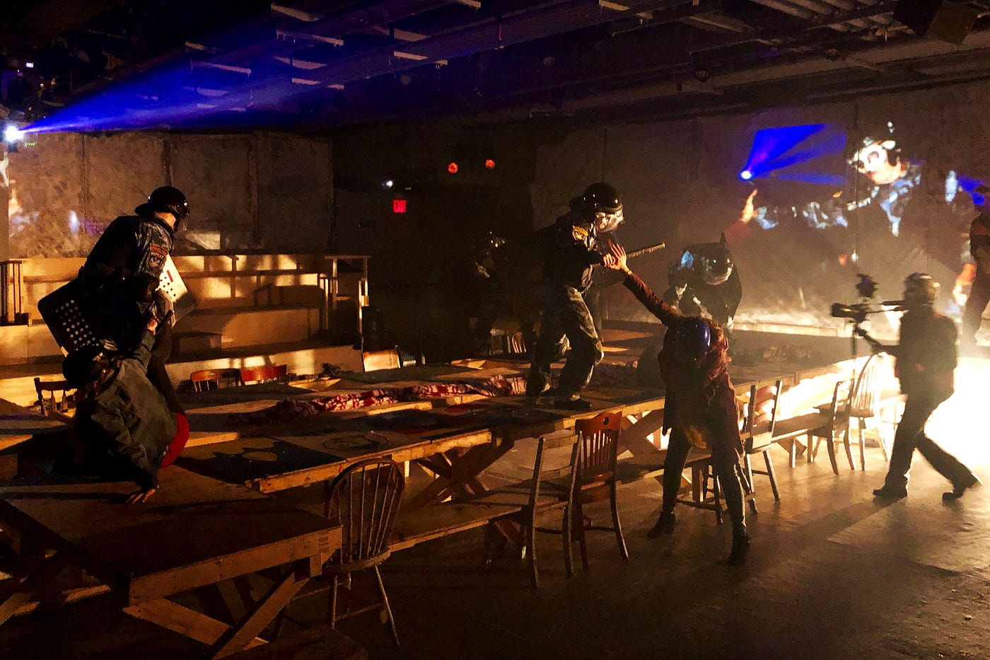 Audience members are thrown straight into the deep end, as the long dinner table in the center of the room turns into a makeshift stage and then gets assembled into a barricade between the protestors and the police. The story and the music flow in a rapid-fire fashion over the course of the next 70 minutes, with about three-fourths of the room choosing to participate in the activities, taking the side of the protestors. But there are no specific characters to follow in this production; the narrative is propelled forward by the progression of these real-life historical events re-enacted in 360 degrees, supplemented by video footage. The energy of the band/cast is infectious as we sing and dance our way through protests, a proposal and a wedding, and scuffles with the police, in this intense recreation of real events.