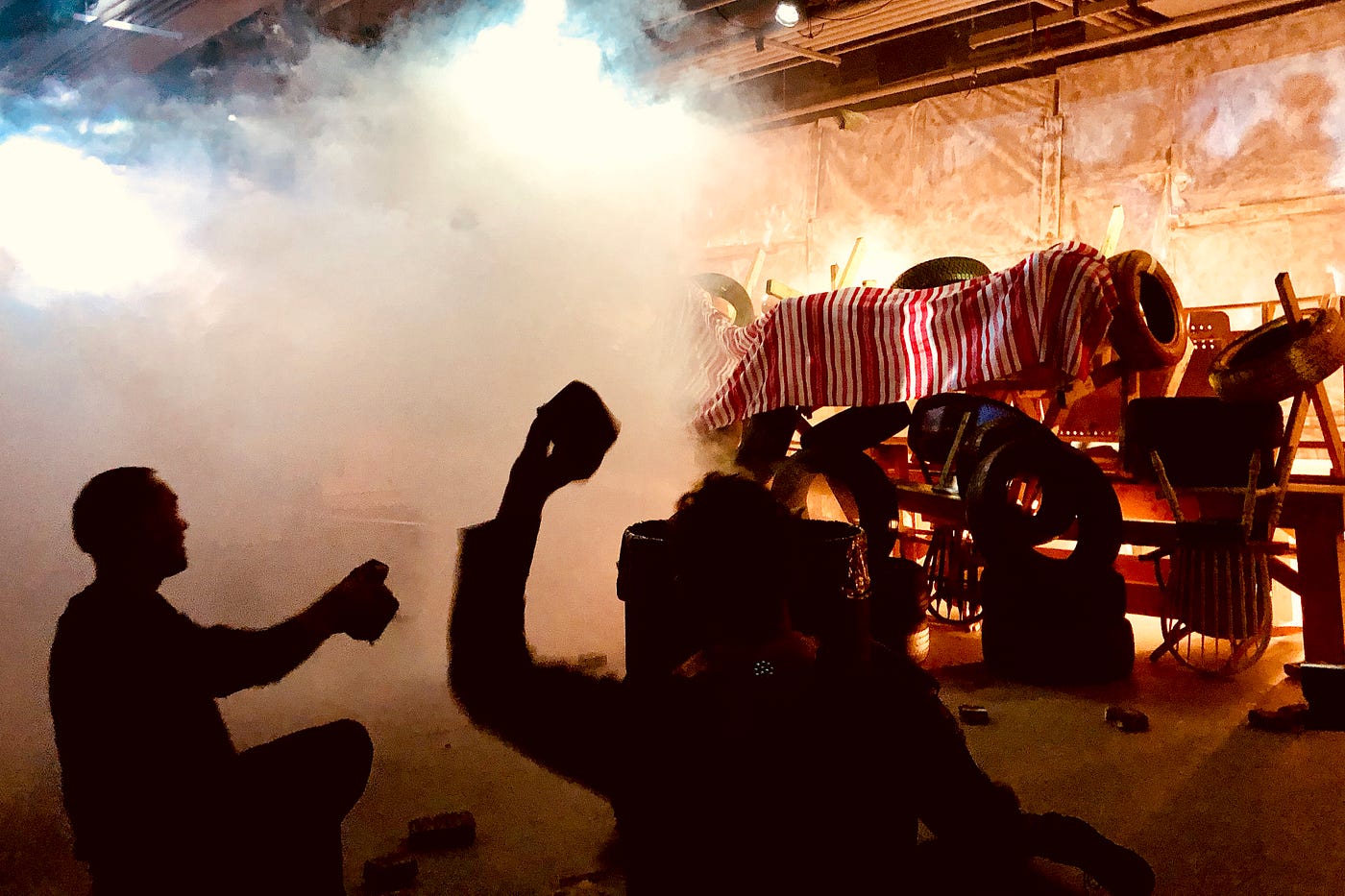 The show does have some wonderfully touching, nuanced moments after the standoff with the authorities goes south. We the audience find ourselves crouching behind a hastily assembled barricade, staring at the line of police in riot gear on the other side. Meanwhile, band members interspersed in the crowd toss spool after spool of ribbon over our heads. The room quiets as we hear the tinny plunk of each spool land against a police shield and fall to the floor. I look up to see sad streams of red flowing down, tossed over piled-up tires and planks of wood. And when one musician runs out of spools to throw, I see him collapse against a nearby table in resignation, his head in his hands.