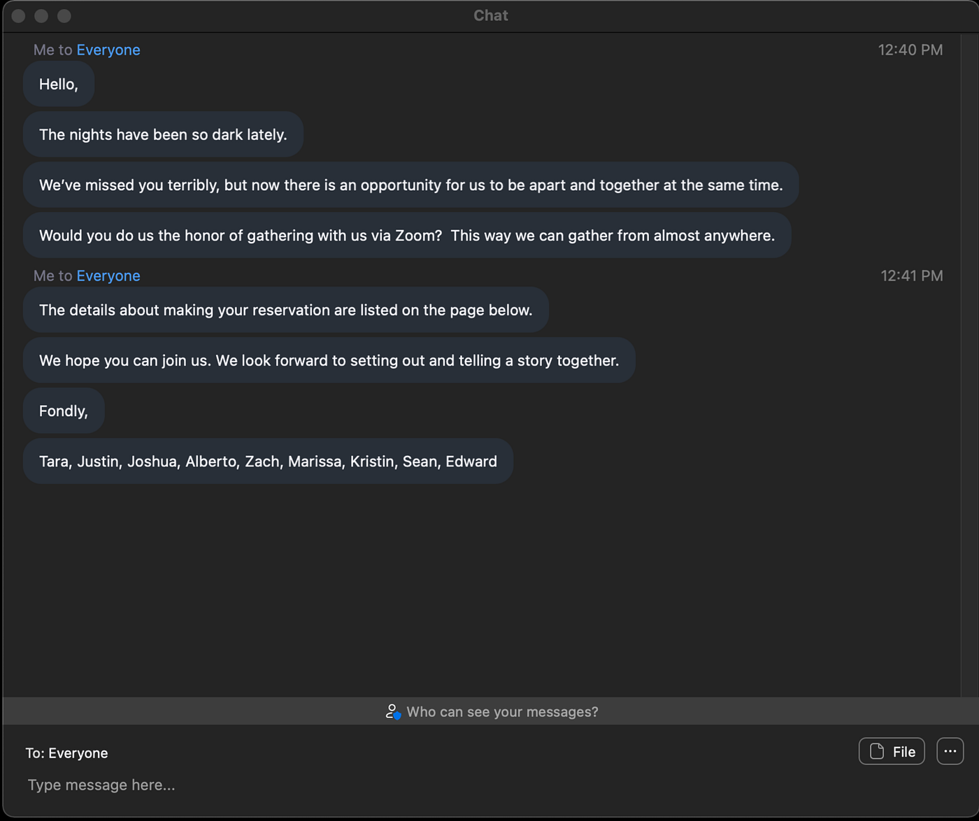 The artifice of a live Zoom show is also directly acknowledged as part of the show. Our performer (Joshua Gonzales) addresses us specifically from the perspective as a person performing in a show, not any sort of fictional character, discussing among other things the shocking intimacy of letting the audience into his living space. But I’m not exactly sure who I am to Joshua and who Joshua is to me. We’re collectively asked some questions about our current locations, such as what exactly we see out our windows at this very moment: it’s essentially icebreaker material that we’re asked to respond to by typing in the chat.