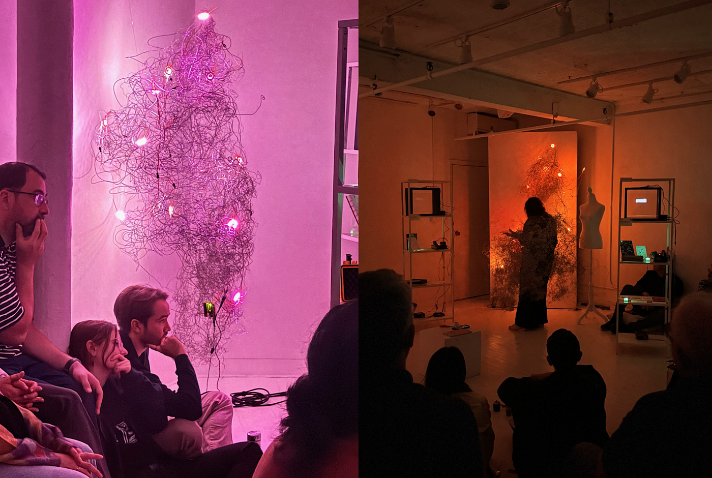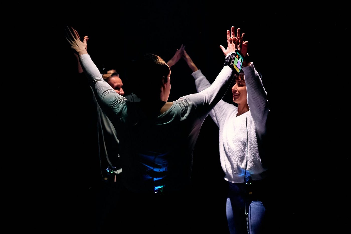 In one particularly meaningful moment, Izaguirre motioned for groups of audience members to grab onto her and each other, making an interconnected ring that affected the blinking lights on a small hand-held contraption she had devised.