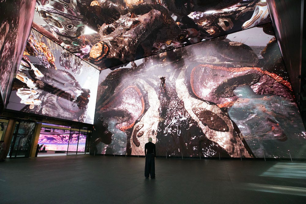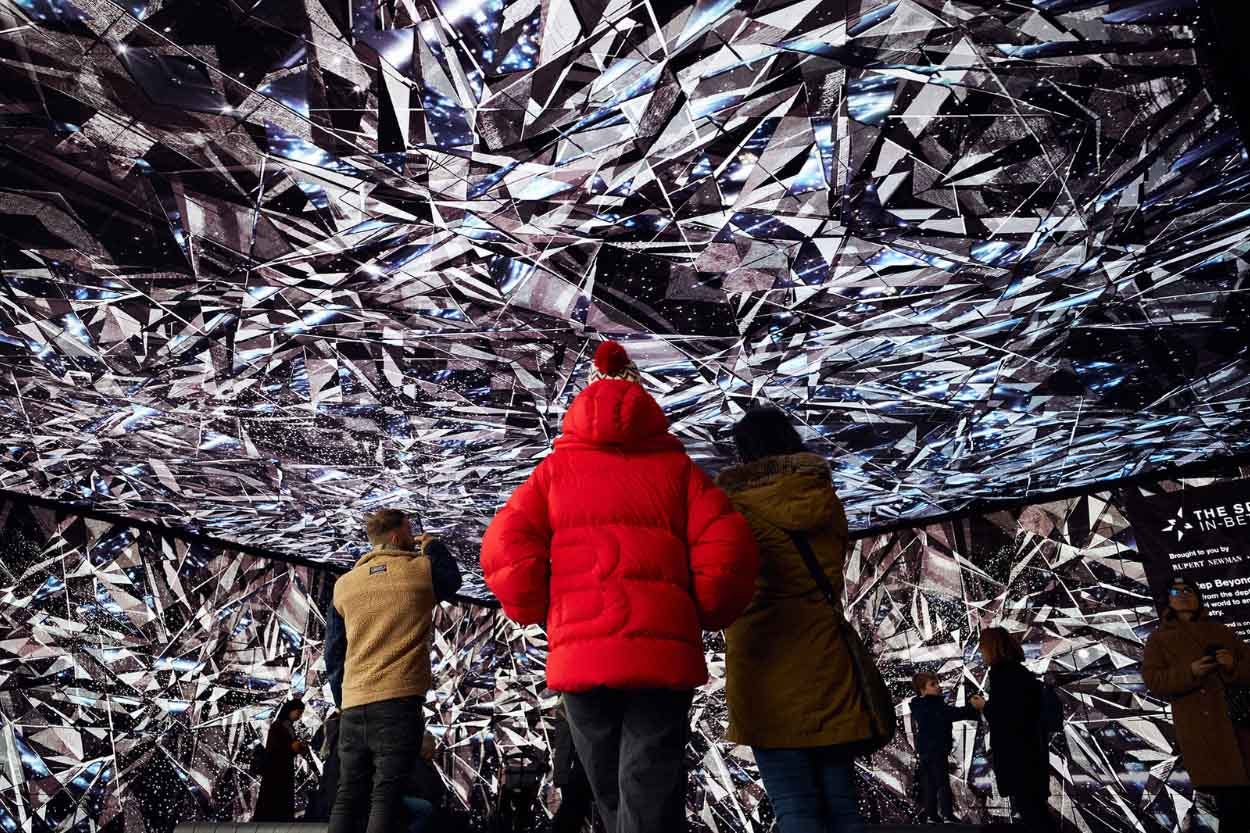 Free wifi, community wardens, and scattered benches rest beneath an immense inner digital canvas: the ceiling and walls covered in a seamless screen which showcases expansive displays of custom art. The vision is overwhelming, demanding passersby to drift through and gape up at the landscape, starscape, tessellation, fireworks, whatever is gleaming from above and around, while also bathing in the ambient soundscape which fills and travels through the space. There are three free public galleries, my favorite being the hallway hidden behind the main two courtyards. This area feels more like a womb of light, a journey through the artwork while relaxing in the auditory resonance.