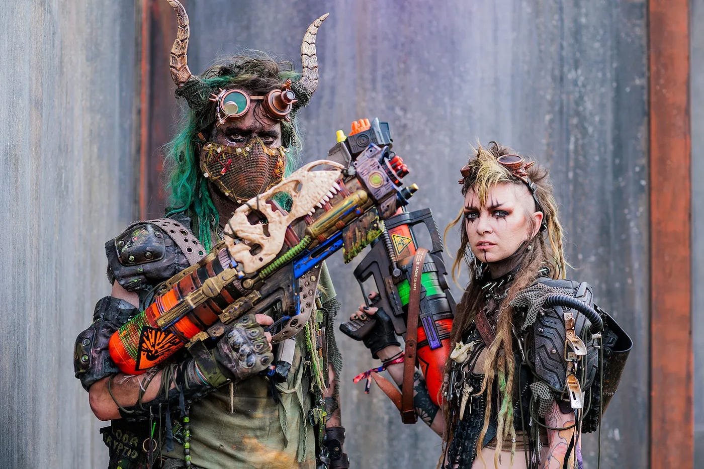 Boomtown is a 66,000 person music festival held in southern England. It has dozens of stages and six immersive districts — mini-towns with actors and detailed sets that are beautiful and diverse, ranging from futuristic to post-apocalyptic to temple-like. Each has at least 10 different structures and venues, so the effect is fully immersive in terms of inhabiting six unique worlds. Actors are present throughout the day, both interacting with attendees and providing general color to enhance the world.