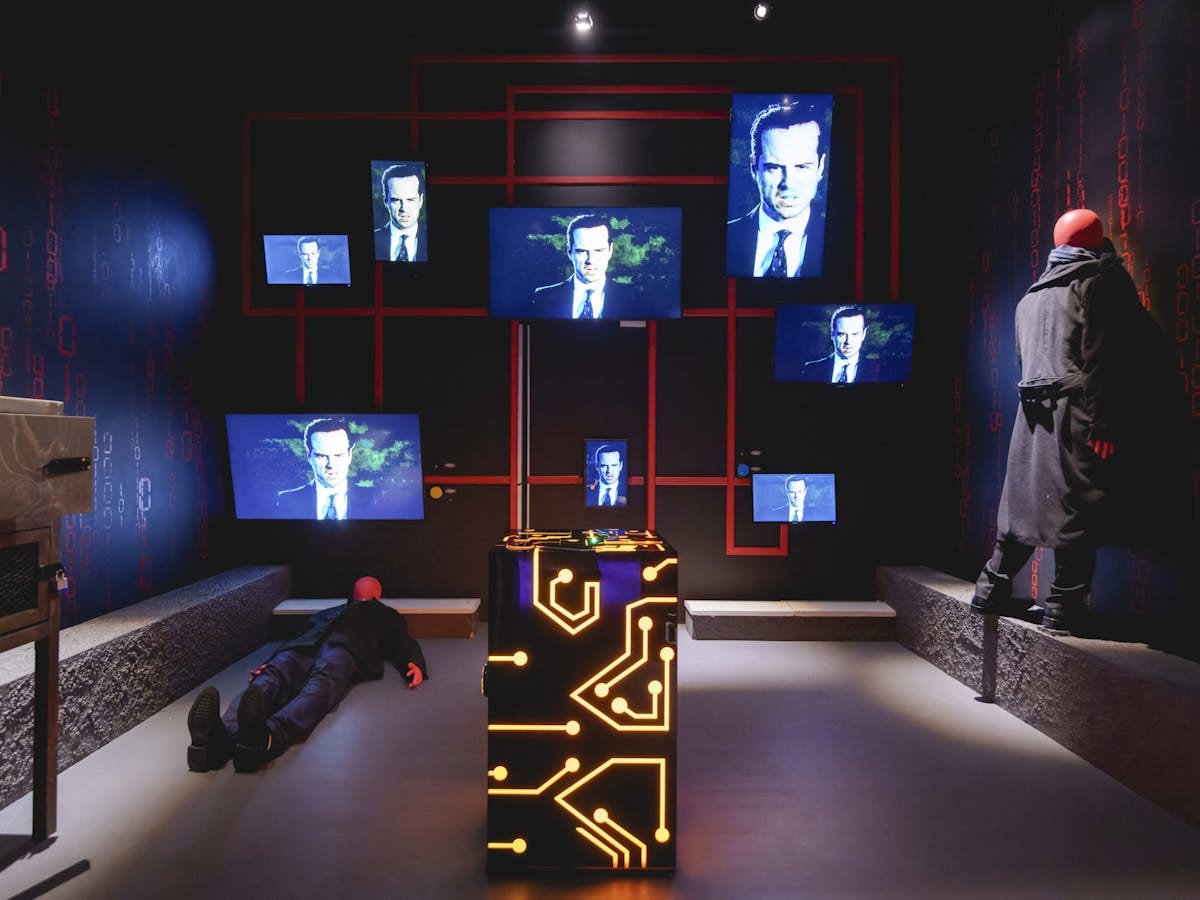 Escorted into a close-scale replica of Sherlock & John’s flat, my latent inner fangirl stifles a little squeal: the iconic wallpaper and spray-painted bullet-hole-ridden smiley face loom behind our sofa while we’re further briefed. And this room is barely the beginning: in all we’ll see six areas fully kitted out with extensive set, prop, lighting, and sound work which fully grounds us in each space.