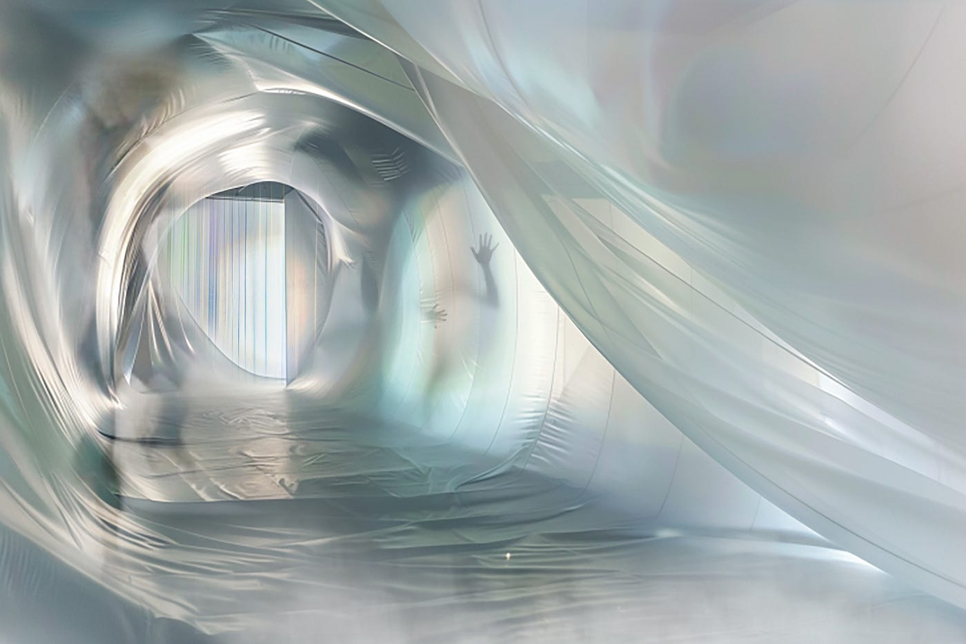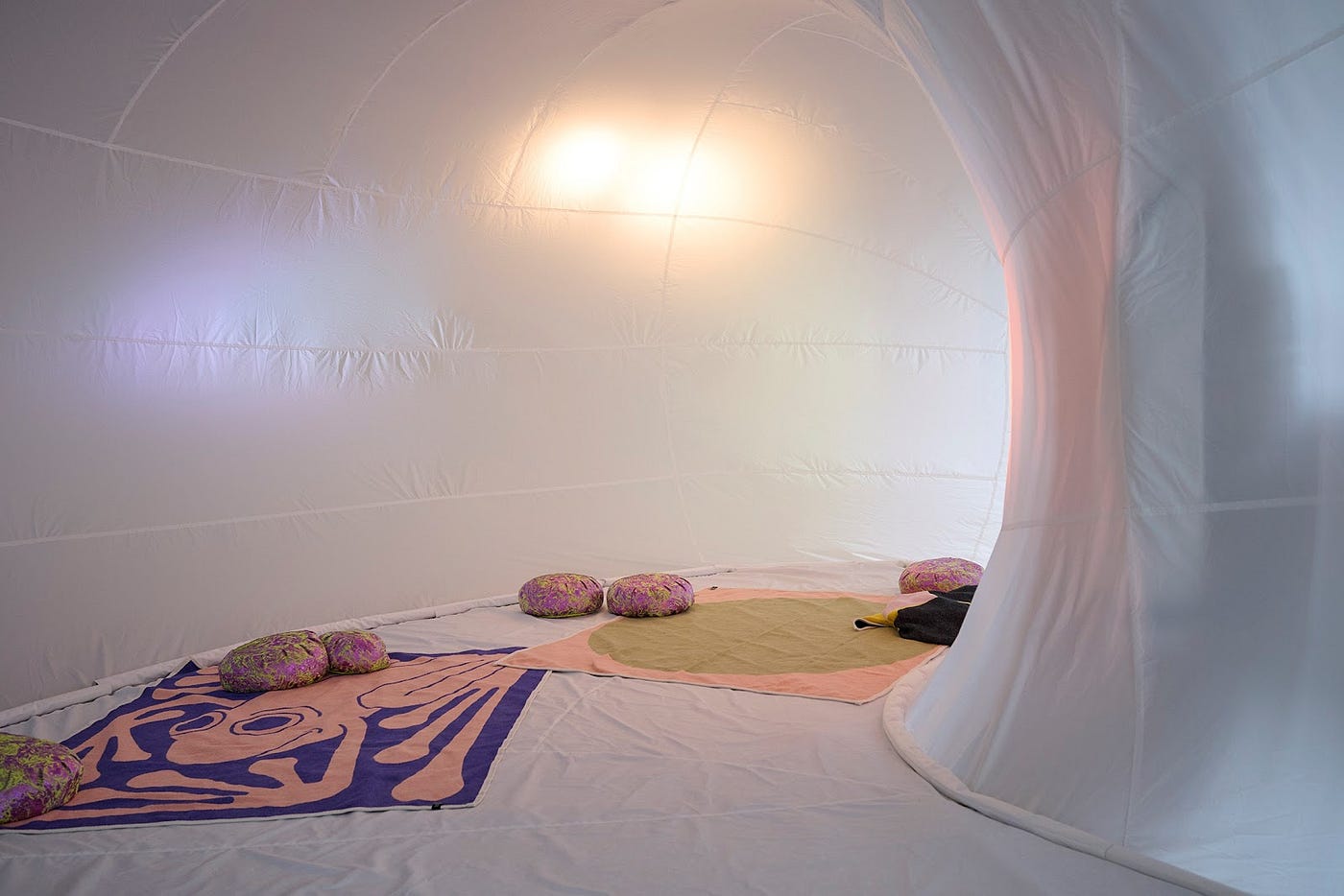 After taking off their shoes, guests enter the soft-floored tunnel, littered with cushions and blankets, and take a seat. As the installation’s title suggests, guests are invited to breathe deeply with the space itself: The walls and ceilings rise and fall, deflating and reinflating like lungs all around you. It’s not entirely unlike being in a slowly collapsing bounce house. In a good way.