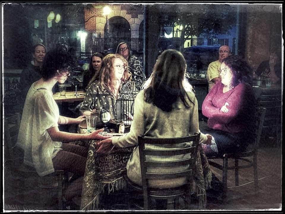 After assembling outside a local historic bar, the intimate audience of 20 was escorted into a back room to take our seats while cautiously staring at a cloaked table in the middle of the room. Our humorously endearing guide introduced himself as a longtime paranormal investigator and walked us through a series of warm-up activities that included a sage smudging, group chanting, and the opportunity for audience members to share stories of their own real-life paranormal experiences.