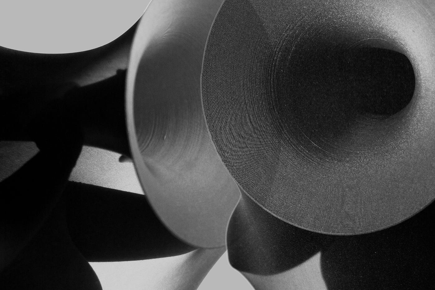 On Saturday, I was reminded of these photos and their symbolism when an industrial loading dock door shuddered open. Shrouded in black gauze with their heads obscured, figures held up black 3D-printed megaphones. Performers moved through the space, alone or in formation. There was no dialogue, only the choreography and eerie vocalizations which ranged from wind-like hushes to guttural screams. Performers’ manipulations of the megaphones created a doppler effect, both magnifying and tempering the sounds. Throughout the warehouse speakers supplied audio from a central stage, on which materials such as paper were “played” against the vibrations of miked subwoofer speaker cones, creating a cacophonous and throbbing sonic thread. This was HIVE RISE.