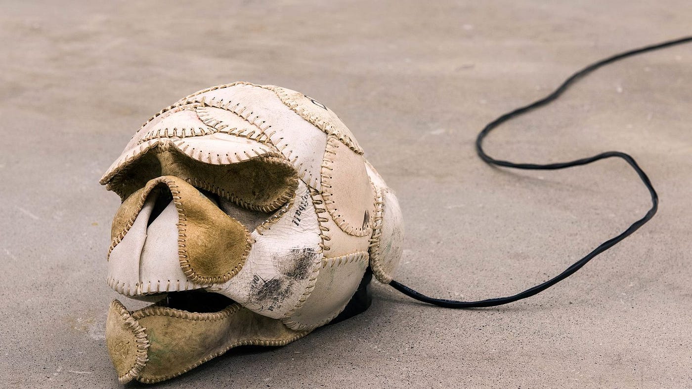 First is The Evening Redness in the West by Canadian artist Brian Jungen. Jungen dismantles baseballs and leather home theater seats and rebuilds them into skulls and a saddle. These are connected to a DVD system and an amplifier casts out audio from western films. With each gunshot, explosion, or brawl the saddle bucks across the gallery on its wooden frame. The skulls and saddle embody violent stereotypes of Indigenous people as depicted in popular culture. The presentation is disarming.