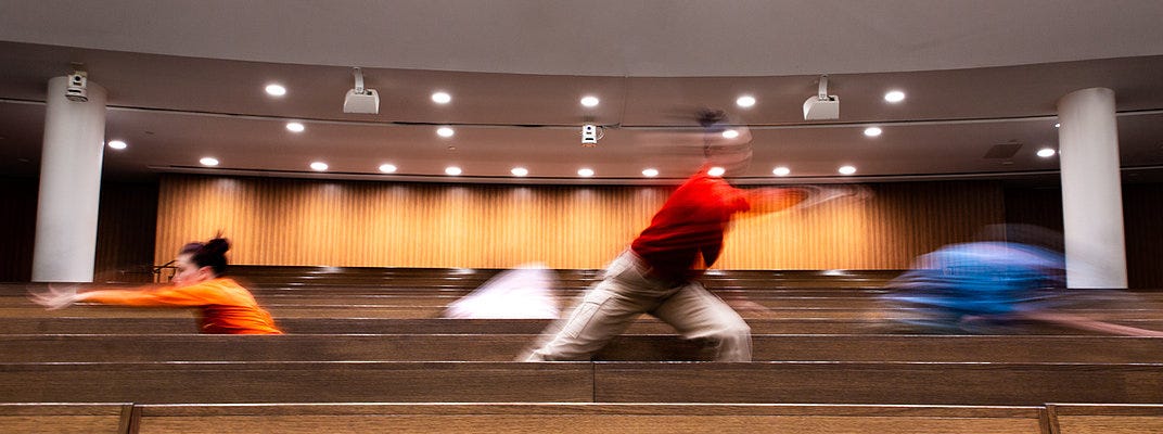 A pre-recorded segment of the dance is of particular note, filmed from a bird’s eye view of the pews. Utilizing every aspect of the pews (and the concrete floor beneath them), the talented athletes are able to play with gravity in a truly breathtaking way. Although there is no direct narrative to the piece, the movement, lighting and sound design create a wonderful atmosphere that invites contemplation and a search for personal meaning as the audience watches the work. We all bring our own stories into the sanctuary, and we are each able to take away from the performance what we need.