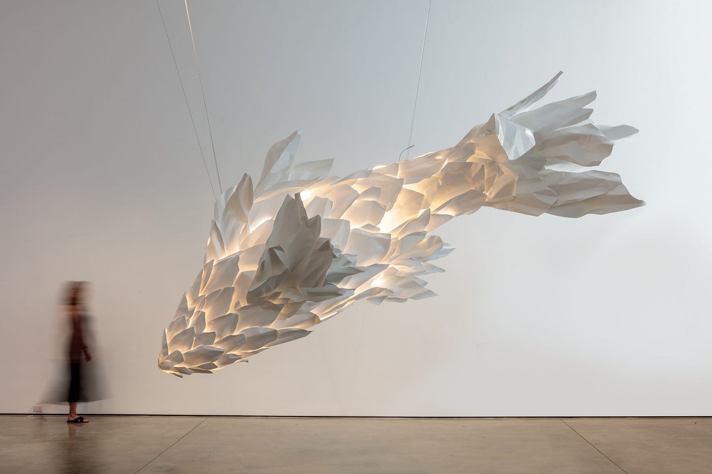 Spinning Tales begins in the main gallery. Massive, internally illuminated “Fish Lamps” are suspended from the ceiling, seemingly preserved mid-swim. Amongst these are smaller, illuminated fish sculptures, skimming the currents of shredded plastic laminate. The sculptures embody the balletic tension of a fish’s form and motion so thoroughly that there’s a disarming, peripheral sense of movement, as though they pause their undulations only when looked upon directly. And, for the first time, two Fish Lamps are constructed in copper. These appear weightless and delicate, as though they’re made of the thinnest, foil membrane, one that would arch from a distant exhale.